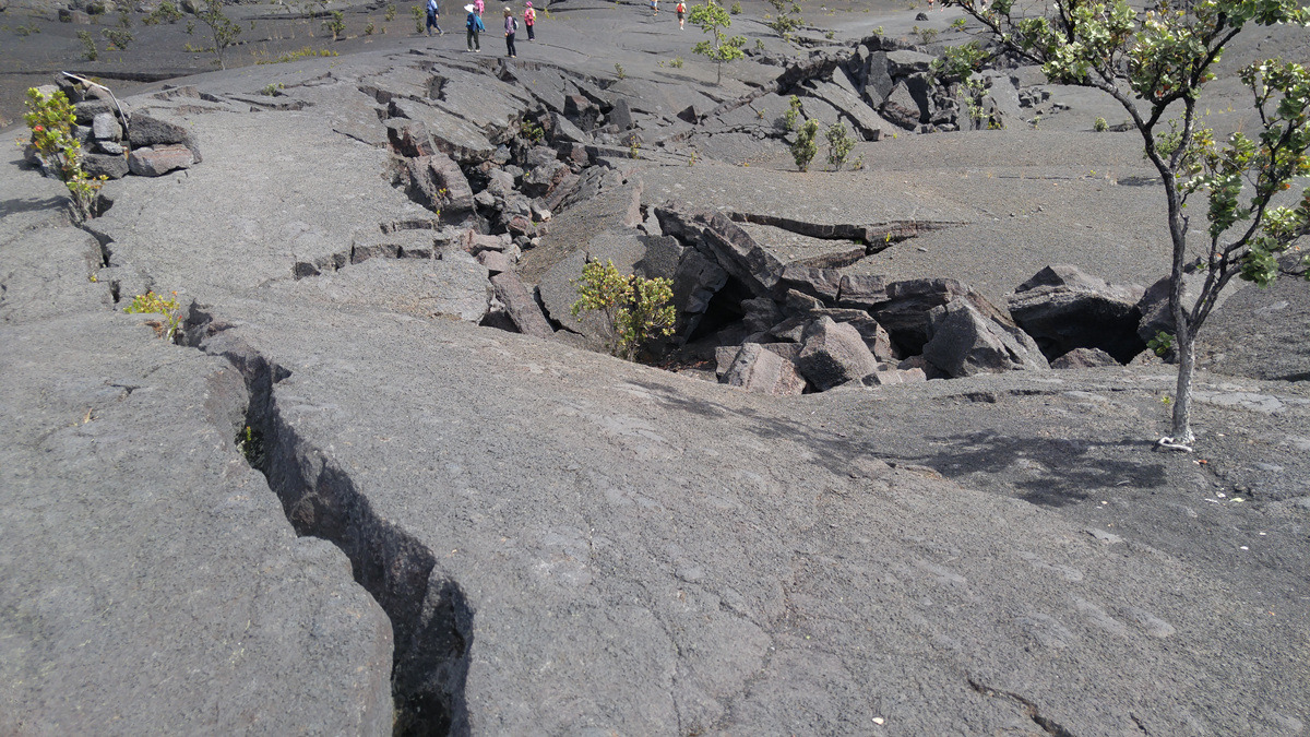용암이 서서히 식으면서 수축하여 판형의 바위와 큰 균열이 생겼다.