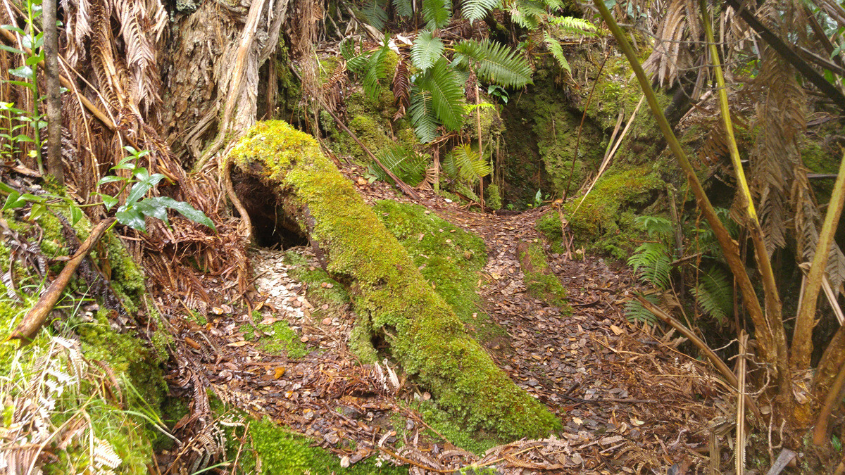 자전거를 묶어둔 곳으로 돌아가는 길, 이키 트레일이 잠깐 도로와 만나는 곳 근처에 라바 튜브가 있다.