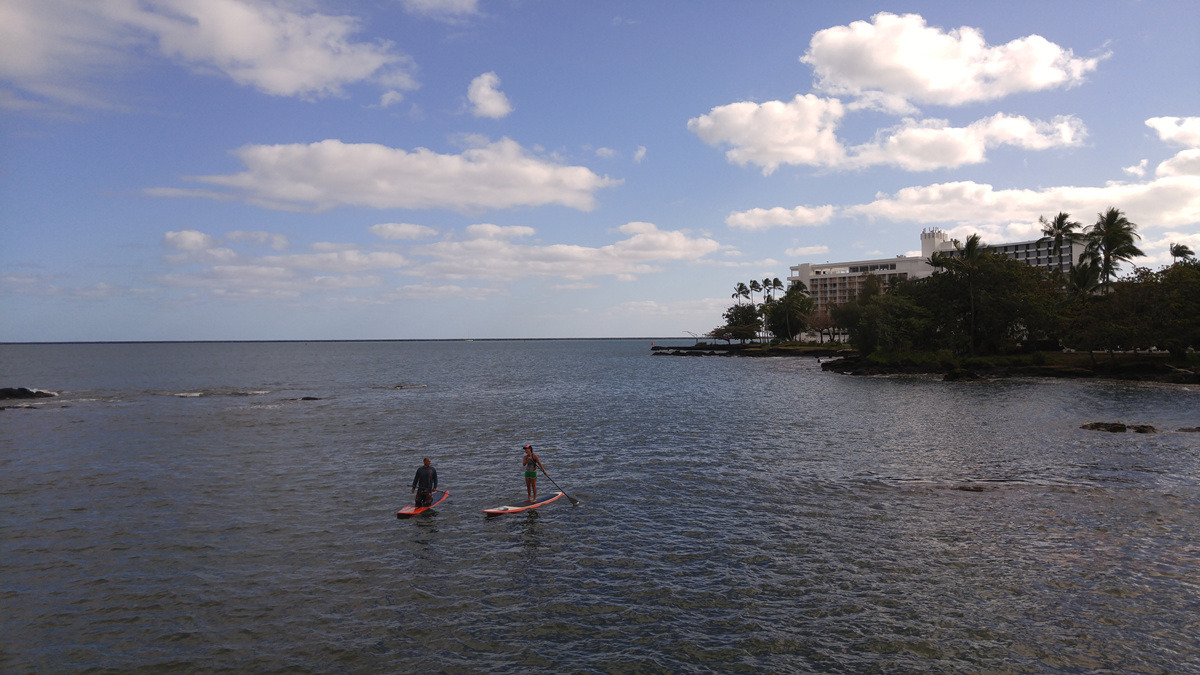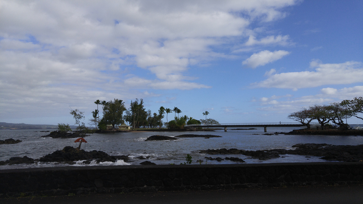 코코넛 아일랜드는 힐로의 호텔들 앞 해변에 있다. 호텔 옆으로 수평선처럼 보이는 것은 방파제다. 방파제로 힐로 만(Hilo bay)를 둘러싸놓은 덕분에 해변에서 잔잔한 파도를 즐길 수 있는 것이다. 방파제 쪽에서 하얗고 커다란 파도가 가끔씩 넘어오는 것을 보면 무시무시하다.