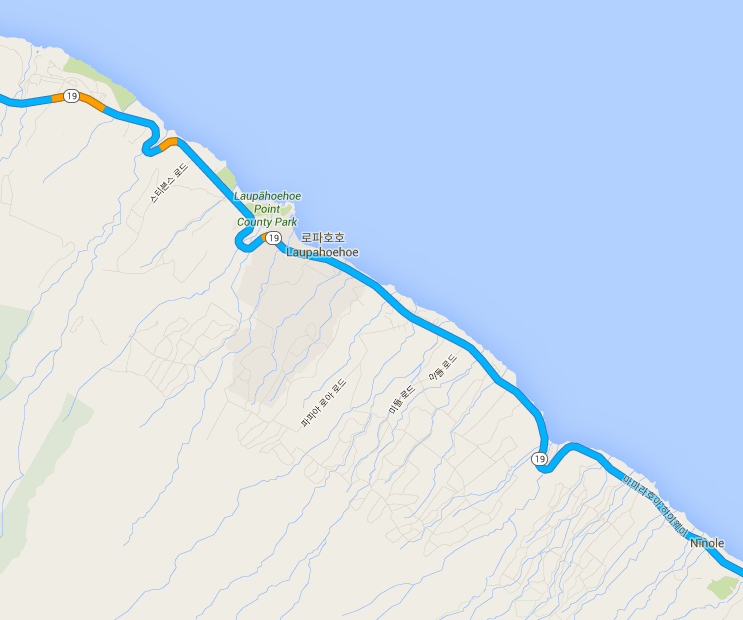 마우나케아에서 흘러내려온 물이 만드는 많은 계곡 중에 깊고 넓은 계곡을 건널 때는 짧은 다리를 건너는 것이 아니라 구불구불 지형을 따라 오르내려야 한다. 세 번 정도 큰 계곡을 건넌다. 지도의 파란색 실선들이 모두 계곡이다.