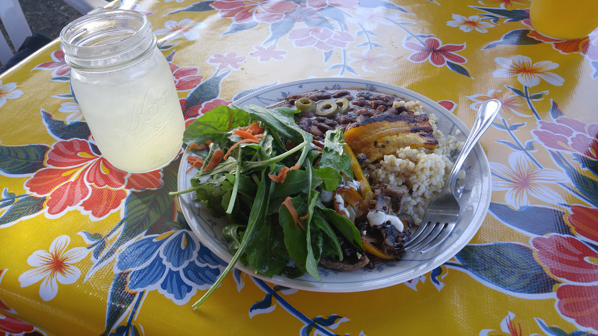 아침도 안 먹고 언덕을 넘어왔으니 배가 많이 고프다. 딱 봐도 몸에 좋을 것 같은... 노점 치고는 꽤 비싼 음식을 한 접시 씩 주문한다. 풀에 가려서 안 보이지만 나는 스테이크, 지니님은 새우 플레이트다. 맛은... 보는 대로 건강한 맛이다.