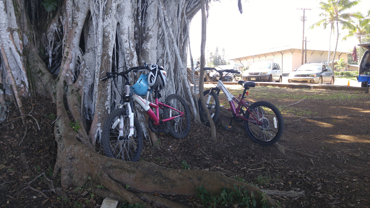 하위에는 커다란 반얀트리가 있다. 반얀 트리 나무 기둥에 아이들이 자전거를 주차해 놓았다.