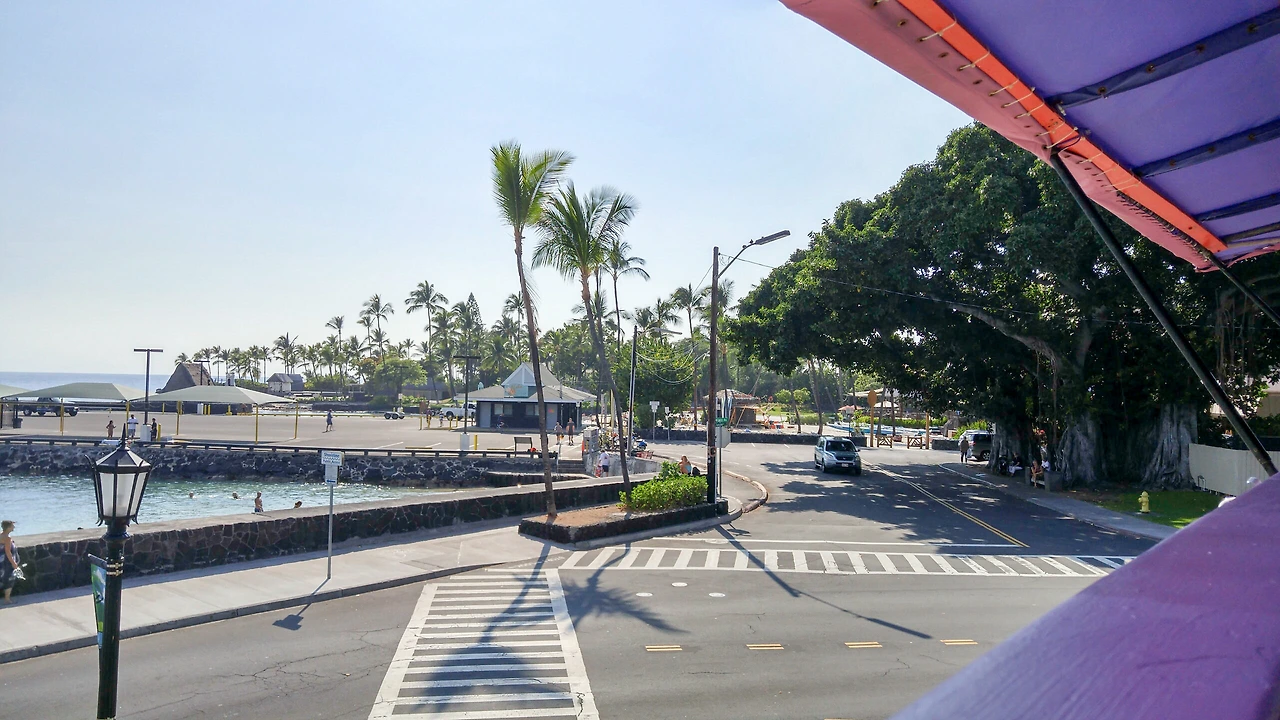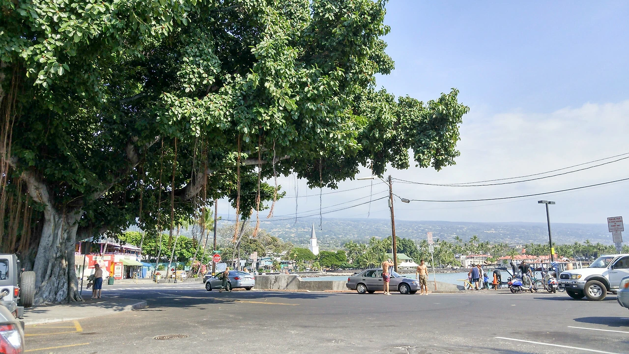 카일루아 만의 반얀트리를 보면서 느긋한 오후를 보낸다. 이 반얀트리 근처가 택시들이 대기하는 곳이라 택시를 타기 편하다. 숙소에 들어갈 때 자전거 가게에 들러서 어제 이야기해놓은 박스를 챙겨가려면 택시를 타야 한다.