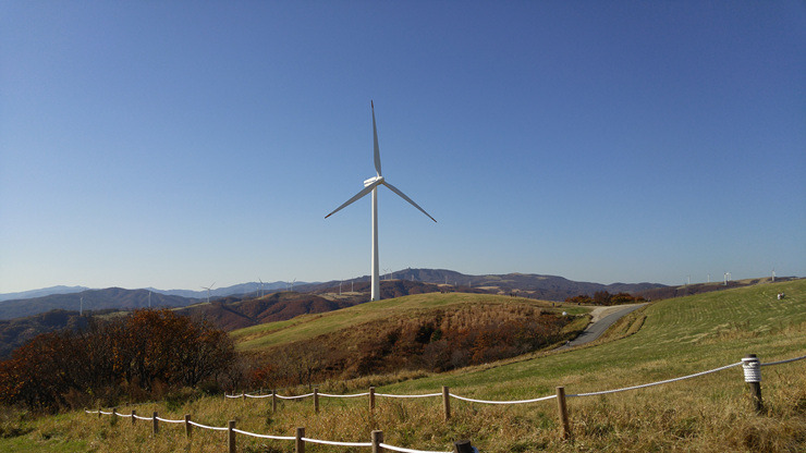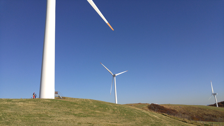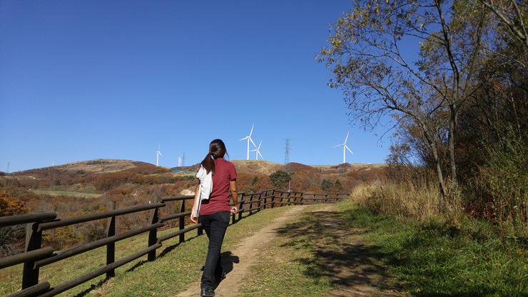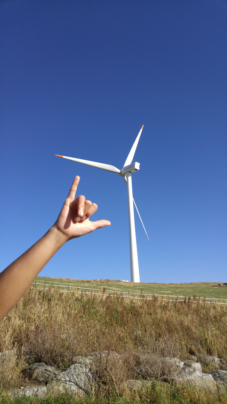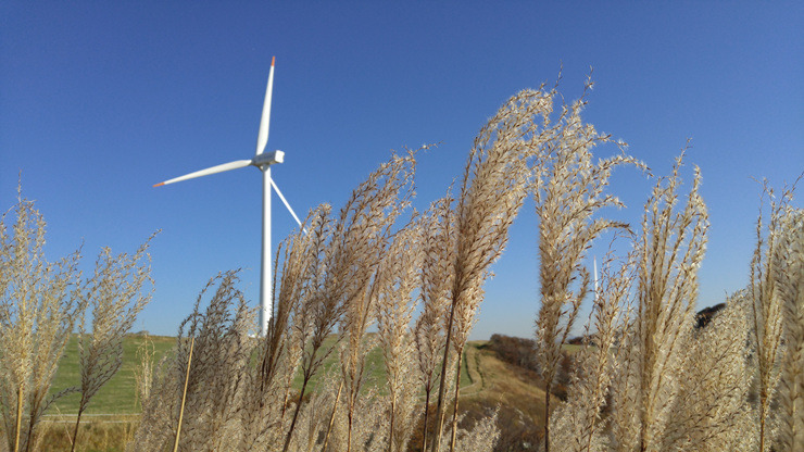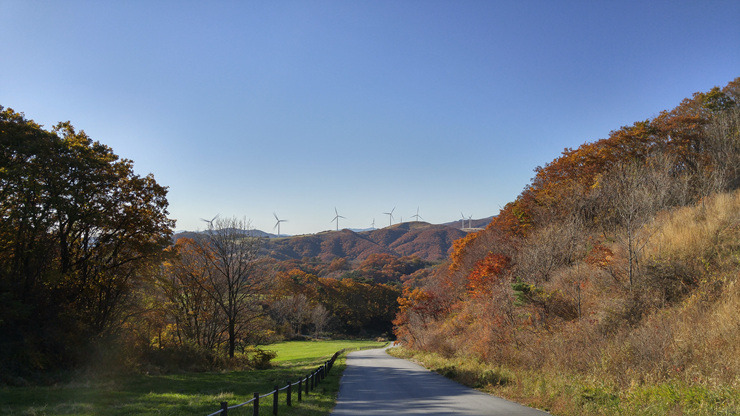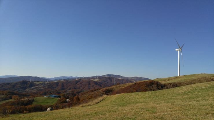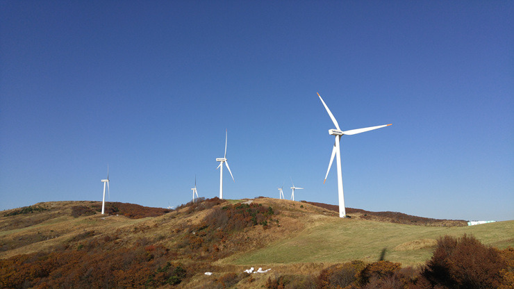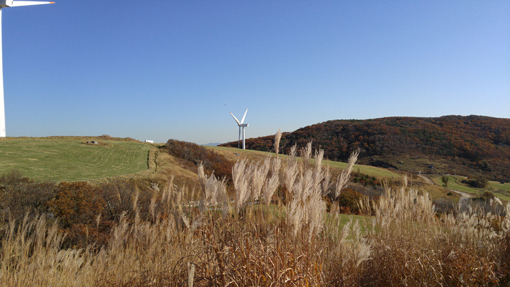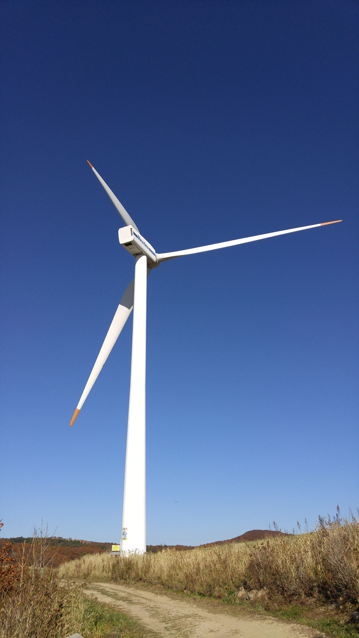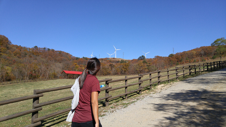 드디어 풍력발전단지까지 왔다. 가을 하늘이 푸르게 맑고 하얀 풍력 발전기가 유유히 돌아간다.