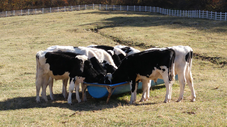 언덕을 잠깐 올라가니 소들이 먹이를 먹고 있다.