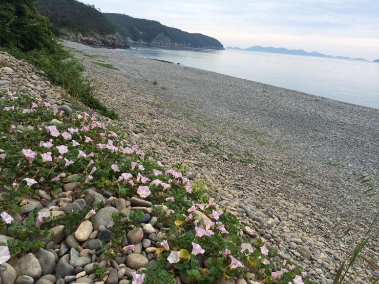 그래도 예쁜 돌 무더기 해변입니다. 산책로를 따라서 갯메꽃이 피어있습니다.