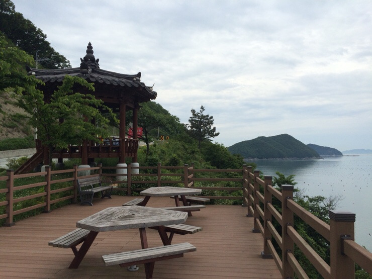 정자에 앉아서 챙겨왔던 주전부리들을 먹습니다. 멀리 장보고 유적지인 장도가 보이네요.