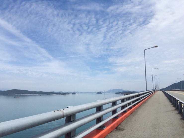 신지대교를 통해서 신지도로 넘어갑니다. 완도에서 가는 방향으로 왼쪽에 널찍한 보행자 자전거 겸용 도로가 있습니다. 그런데... 신지대교 휴게소 즈음에 갑자기 횡단보도도 없이 자전거길이 없어져서 조금 당황스럽습니다. 조심해서 정주행 방향으로 길을 건너서 다시 진행합니다.