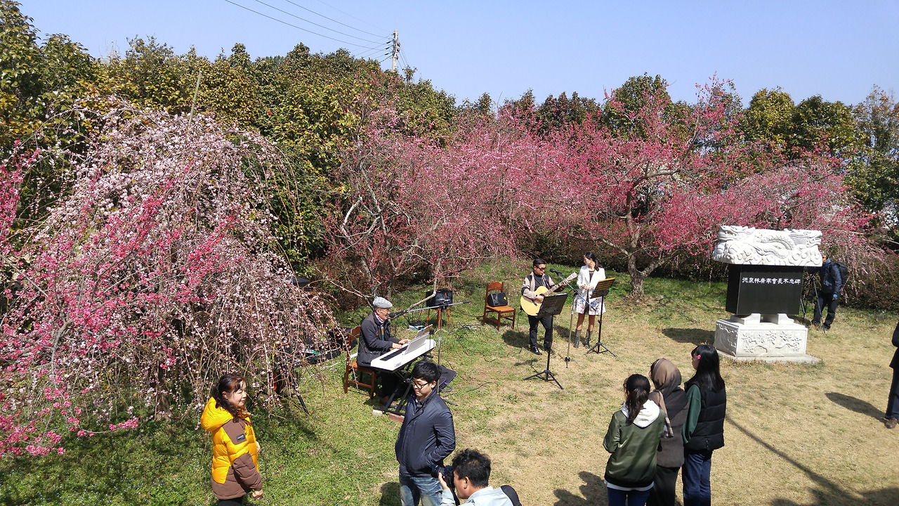 마을회관 뒤쪽 마당에는 홍매화들 사이에서 작은 음악회가 열리고 있습니다.
