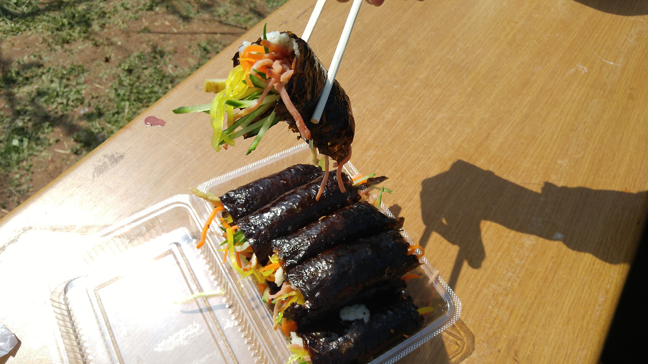 오이, 당근, 단무지, 어묵, 햄이 가득 들어서 꼬마김밥이라 하기엔 너무 푸짐한 김밥을 5천 원에 10개 가득 담아주십니다. 테이블에서 먹고 있으니 지나가는 사람들마다 물어보고 주문하러 갑니다.