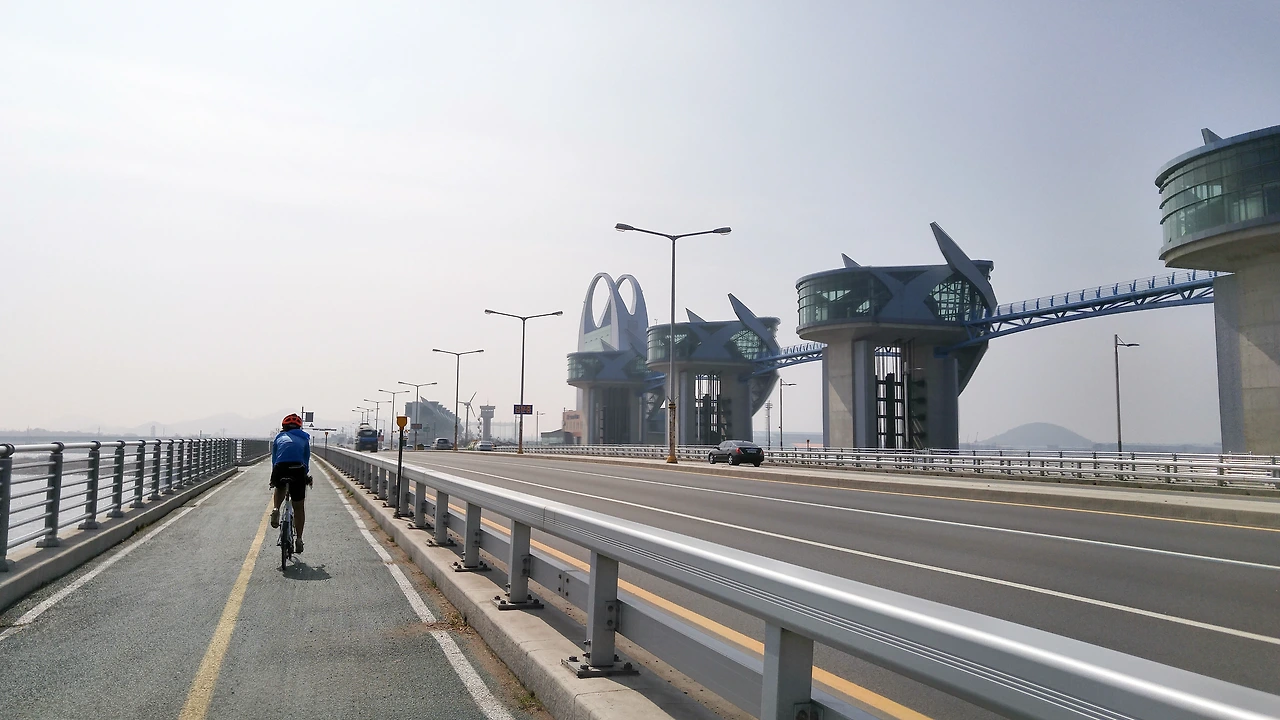 영암금호 방조제 근처에서 잘 닦인 자전거길은 끝나지만 자전거 통행이 가능한 방조제 뚝방길이 이어져 있습니다.