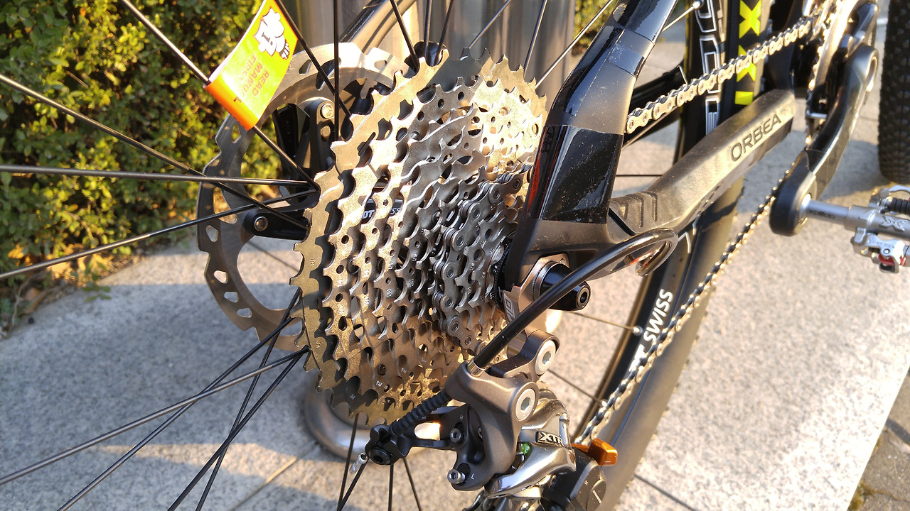 스프라켓(뒷 기어) 역시 신형 XT 11단이다. 1단(프레임 쪽 가장 큰 기어)이 42개의 톱니(42T)라서 27.5인치 바퀴의 산악자전거들의 고질적인 문제였던 등반 능력 부족을 해결하였다.