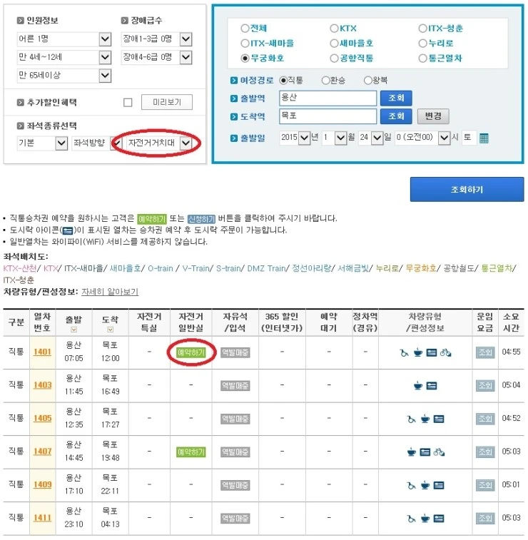 레츠코레일 사이트에서 출발역과 도착역 그리고 날짜를 입력하고 자전거거치대를 선택하면 자전거거치석을 이용할 수 있다.