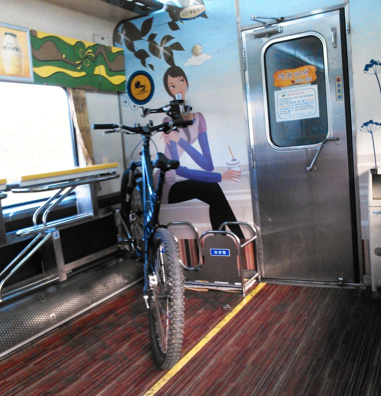 한국철도공사(코레일; Korail)의 운송 방침상 일반 열차에는 기본적으로 자전거를 가지고 탈 수 없지만 자전거 이용객이 많아짐에 따라서 무궁화호의 일부 구간에 자전거 거치대를 마련하여 한 열차 당 5대의 자전거를 카페 열차칸에 거치할 수 있게 되었다.