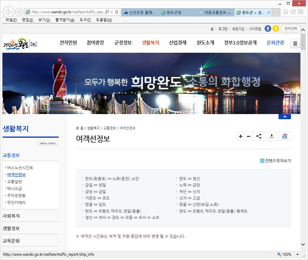 이전에는 신지도와 조약도를 오가는 배편이 있었지만 현재는 폐쇄된 완도군 신지도의 방죽포항과 같이 인터넷 지도에는 배편이 있는 것처럼 표시되지만 실제로는 배편이 없는 경우도 있기 때문에 철저한 정보 수집이 필요하며 배 시간을 놓치거나 배편이 없을 경우의 대안도 생각해야 한다.