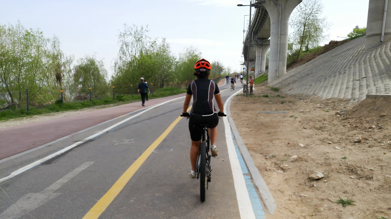 풀서스펜션 산악자전거에 적응하기 위해서 일단은 한강 자전거길에서 달려보았다. 자전거와 사람이 서로 길들여져야 하는 것이다. 다음번에는 로드바이크로는 올라가기 어려운 언덕길이 포함된 코스와 약간의 비포장이 있는 평지 위주의 코스를 달리면서 길들이기를 진행할 것이다.