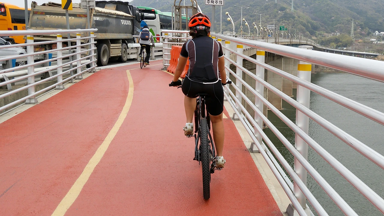 팔당대교 입구의 오르막도 힘든 경사도는 아니지만 헤어핀 부분에서 지니님이 27.5인치 큰 바퀴 자전거의 코너링에 익숙하지 않은 모습을 보인다. 워낙 작은 바퀴(451)만 타다가 갑자기 큰 바퀴(650b)를 타서 그런 것 같다. 타다 보면 점차 익숙해질 것이다.