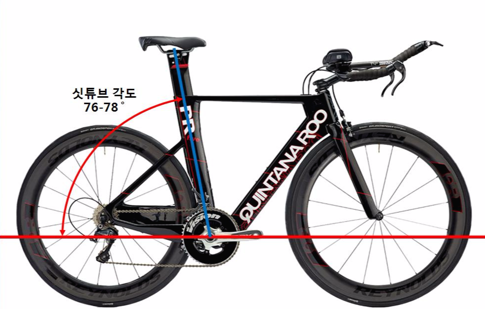 먼저 프레임의 형상이 다르다. 특히, 자세히 봐야 할 부분은 싯튜브의 각도이다. 싯튜브는 BB(크랭크 축)부터안장까지 이어지는 튜브(파란색 선)로 철인 경기용 자전거들은 지면을 기준으로 76~78도 정도 기울어져 있다. 72도 기울어져 있는 로드바이크에 비해서 좀 더 하늘로 뻗은 공격적인 형상이다.