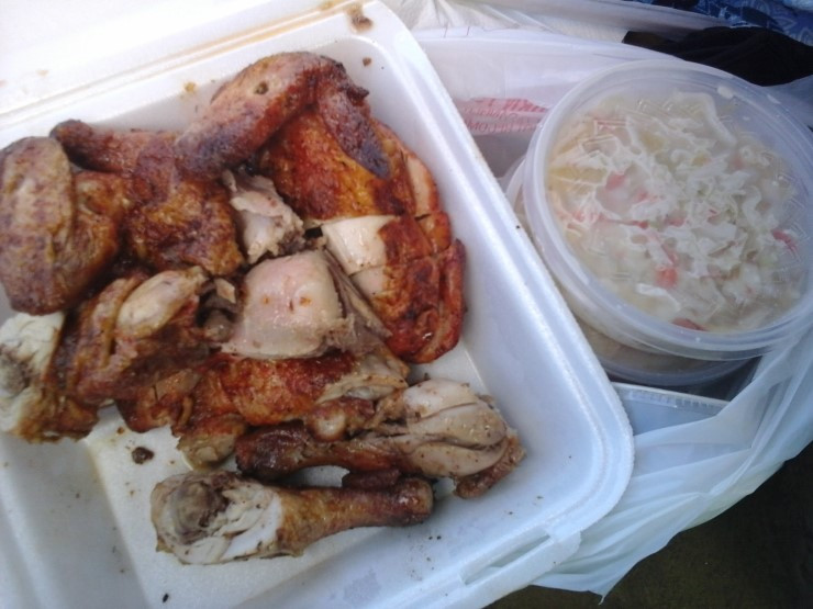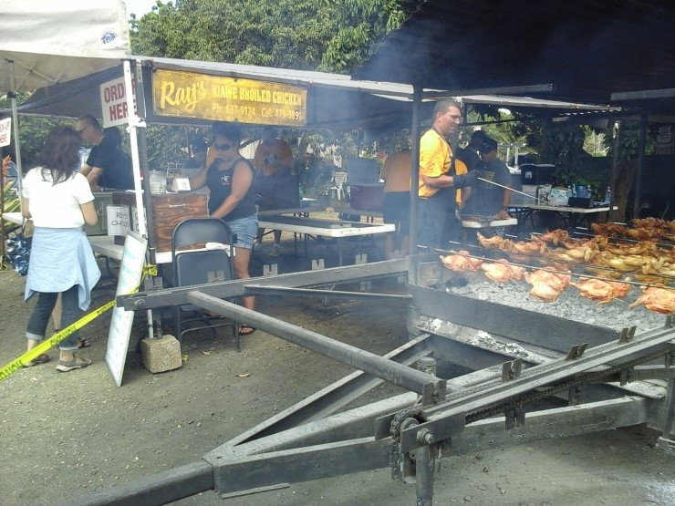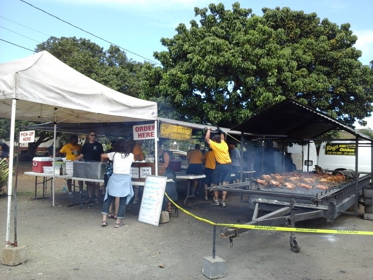 할레이바에서 주말에만 맛볼 수 있다는 바비큐 통닭집 레이스 치킨(Ray's chicken)이 문을 열었다. 지니님이 일정을 짤 때, 여기 통닭을 맛볼 수 있도록 일정을 짠 것이다. 식당이 아닌 테이크아웃 전문의 노점이라 앉아서 먹을 수 있는 테이블이 없으니 적당히 근처 벤치에 앉아서 먹는다. 하와이에서 가장 맛있는 치킨이라는데 정말 맛있다.