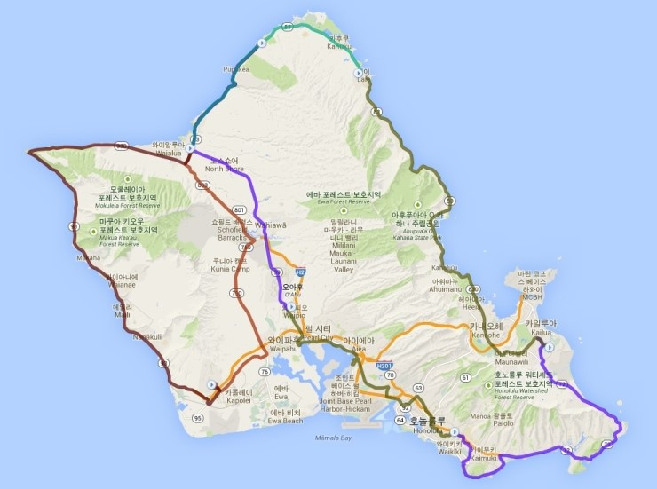 오늘은 다시 오아후 중간의 언덕을 넘어가는 날이다. 지난번에는 카우코나후아 로드(803번)와 쿠니아 로드(750번)를 이용해서 넘어갔는데 이번에는 카메하메하 하이웨이(99번)를 이용해서 넘어간다.
