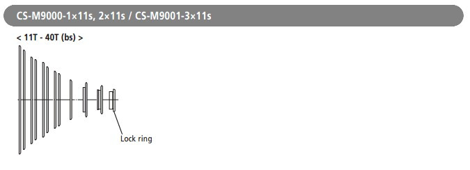 XTR 스프라켓은 예전부터 2장씩 분리되는 부분이 많다. XTR M9000 스프라켓은 2+2+2+2+1+1+1=11단으로 구성되며 11-40T (T: 톱니 수)이다.