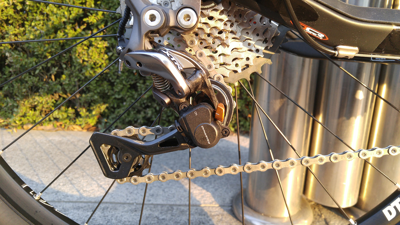 XTR Di2는 변속 와이어(변속선)가 아닌 전동 장치를 이용하는 전동 변속기이다. 와이어 방식처럼 늘어나거나 변속 트러블이 발생하지 않는 장점이 있으나 주기적으로 충전을 해야 하며 와이어 방식보다 가격이 훨씬 높다.