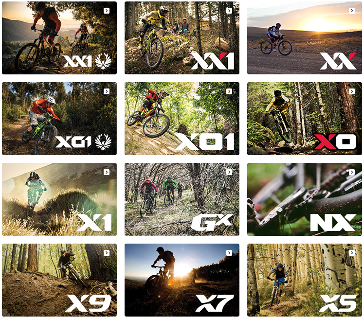 매 마크가 있는 XX1 Eagle과 X01 Eagle은 최신 제품인 12단 구동계를 뜻한다. X1, Gx, NX는 X9, X7, X5에 대응하는 신형 싱글 체인링 구동계이다.