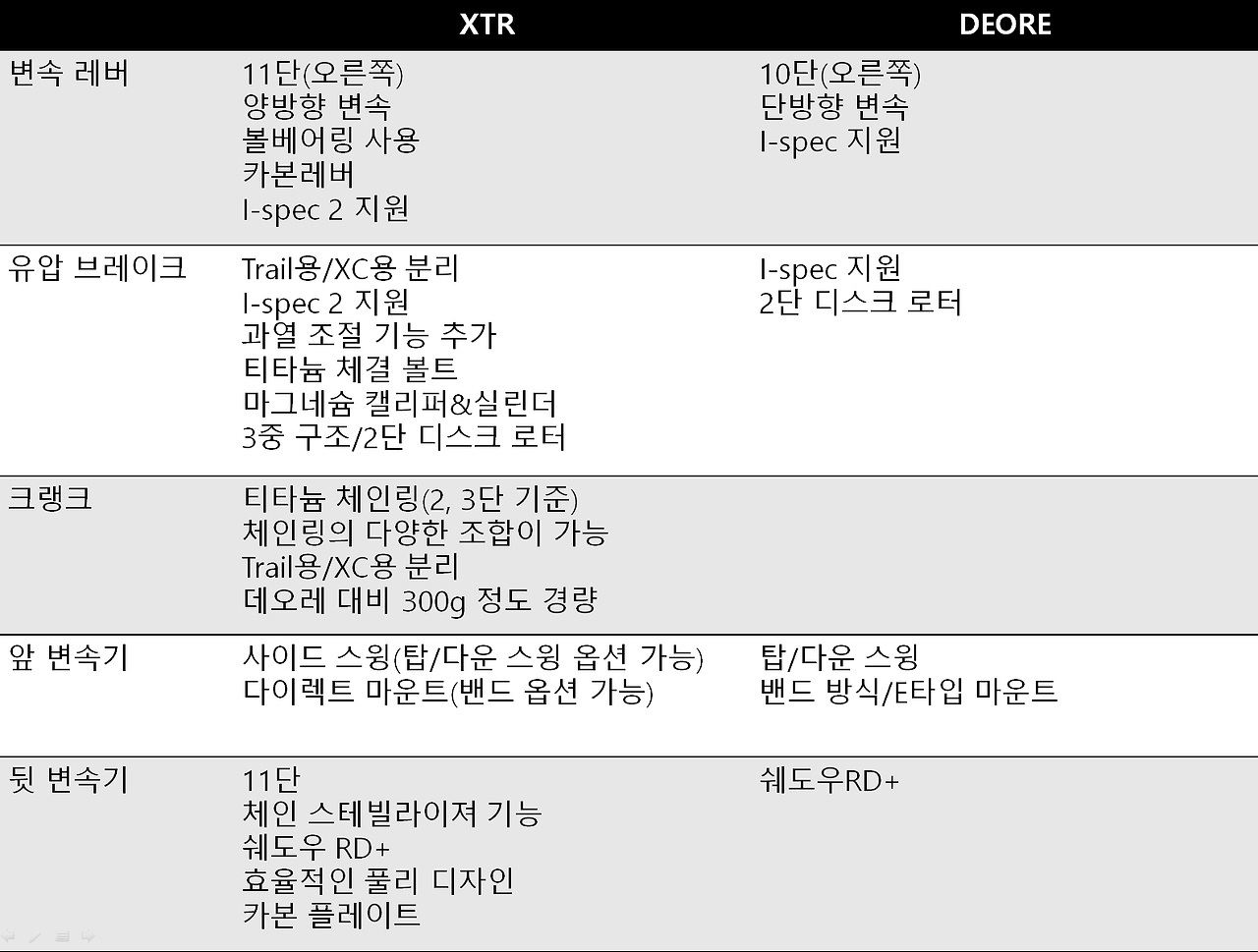 자세하게 설명하지는 않았지만 Deore에 비해서 XTR이 상당한 기능을 가지고 있는 것을 알 수 있다.
