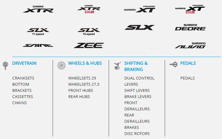 시마노 홈페이지에서 산악자전거 구동계 항목을 보면 이렇게 다양한 제품들이 있다.