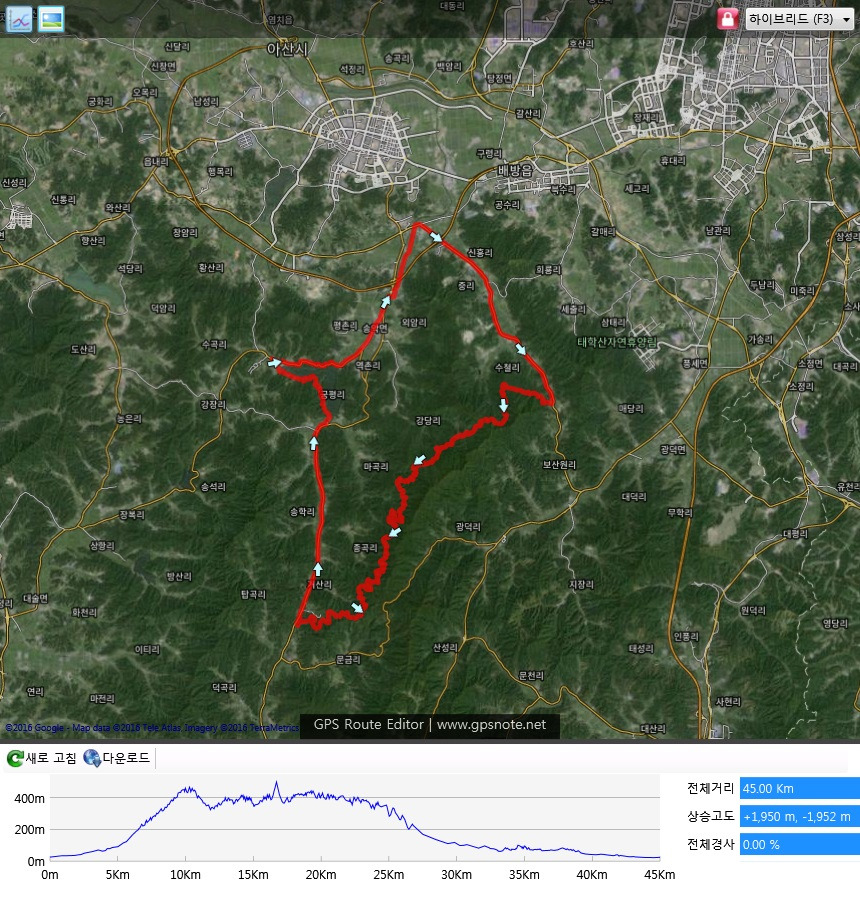 광덕산 임도와 송악 저수지길을 약 45 km 정도 탔다. 실제 임도와 비포장길은 25km 정도이며 어려운 코스가 없어 초보자가 다니기에 좋은 코스이다. 광덕산 임도 끝에서 바로 주유소 위로 이어지는 봉수산 임도를 탄다면 간단한 도시락을 지참해야 할 것이다. 전철을 이용할 경우 배방역에서 출발해서 온양온천역에서 복귀할 수 있지만 전철 왕복 시간이 상당히 많이 소요된다.