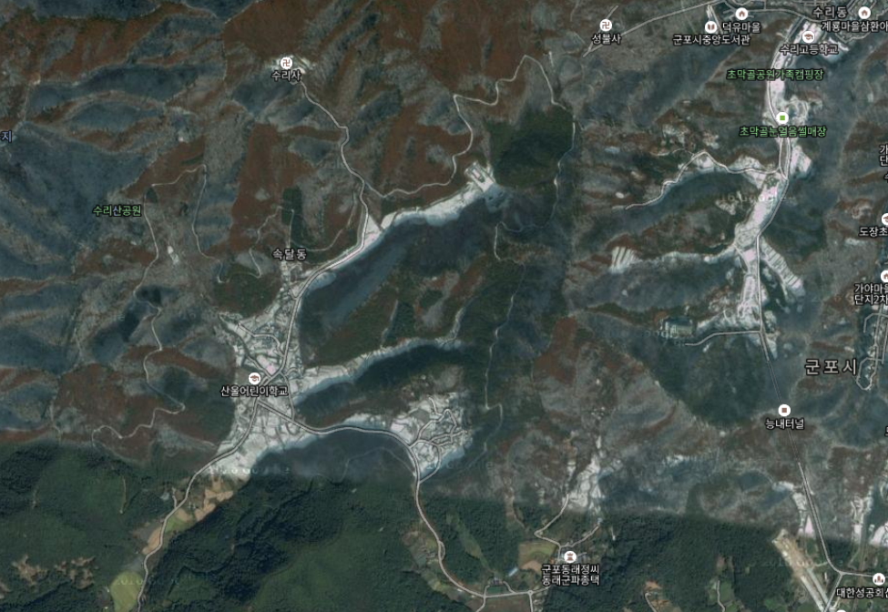 오른쪽에 보이는 망경산 중턱의 긴 줄이 우리가 갈 광덕산 임도이다.