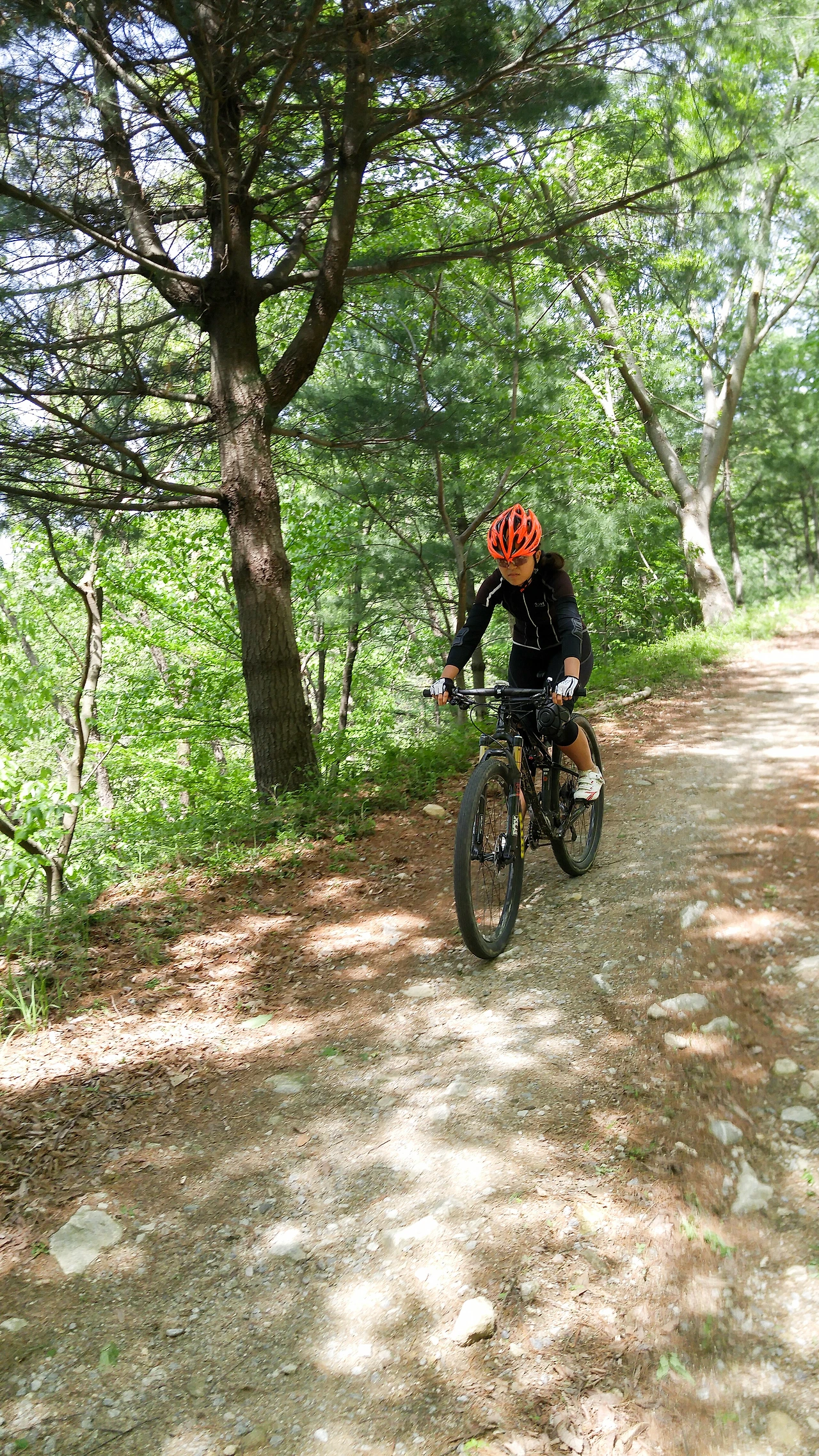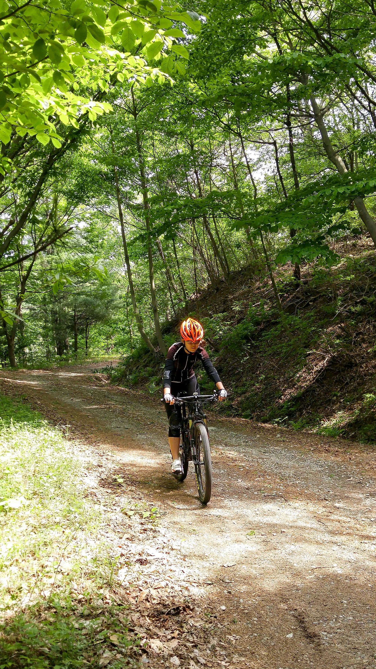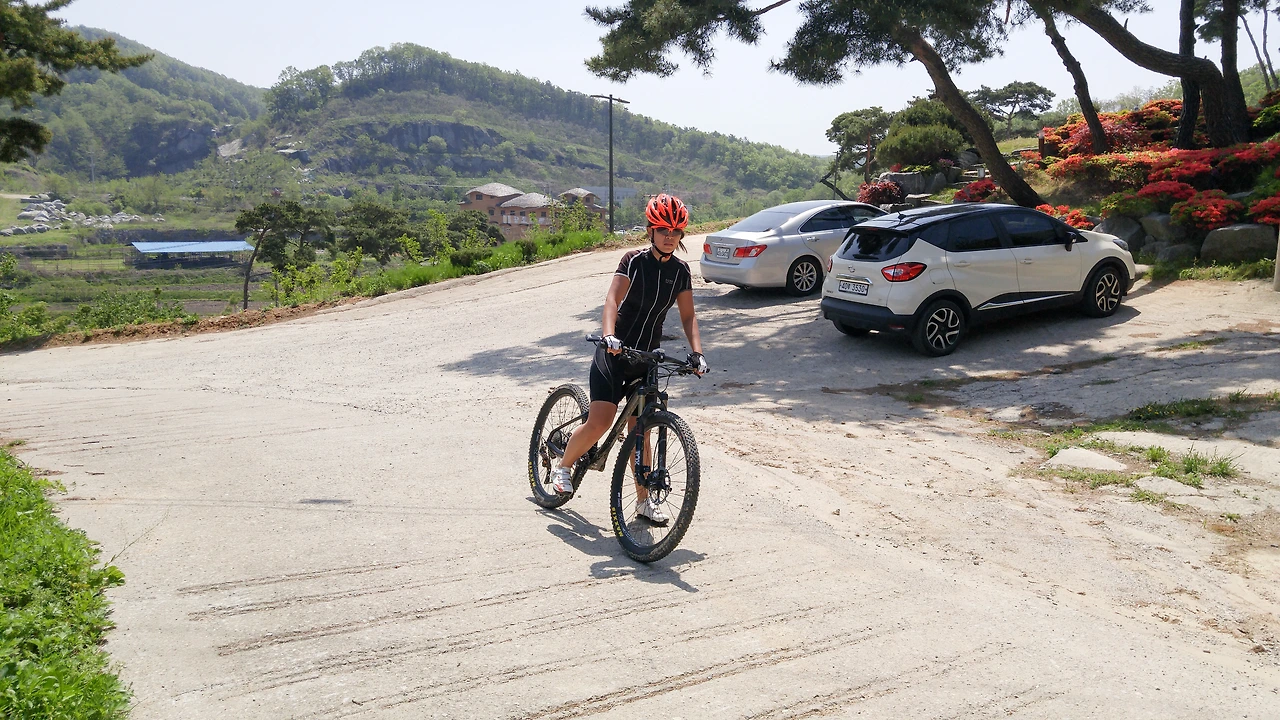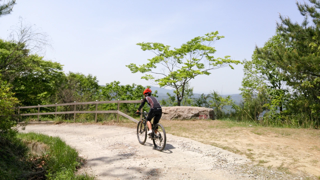 한참 달리다 보면 광덕산 임도에서 단 한 번 있는 약간 급경사인 헤어핀 코스가 나온다. 그렇게 어렵지 않은 경사이긴 하지만 잘 올라간다. 다음에는 좀 더 가파른 경사가 있는 코스를 가게 될 것이다.