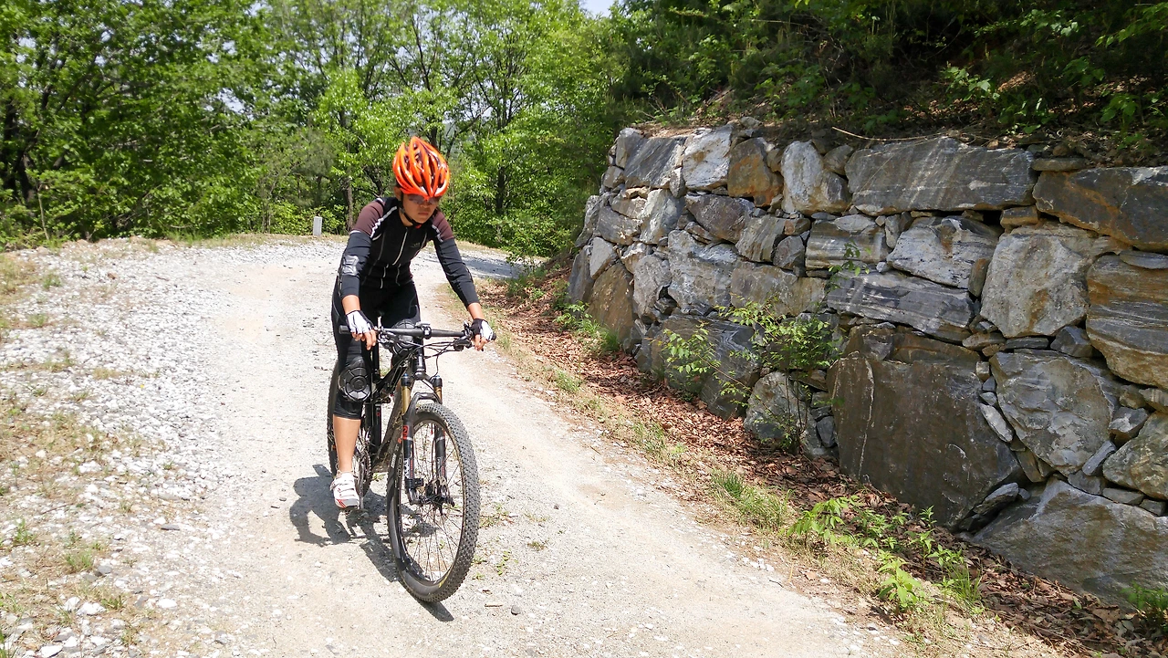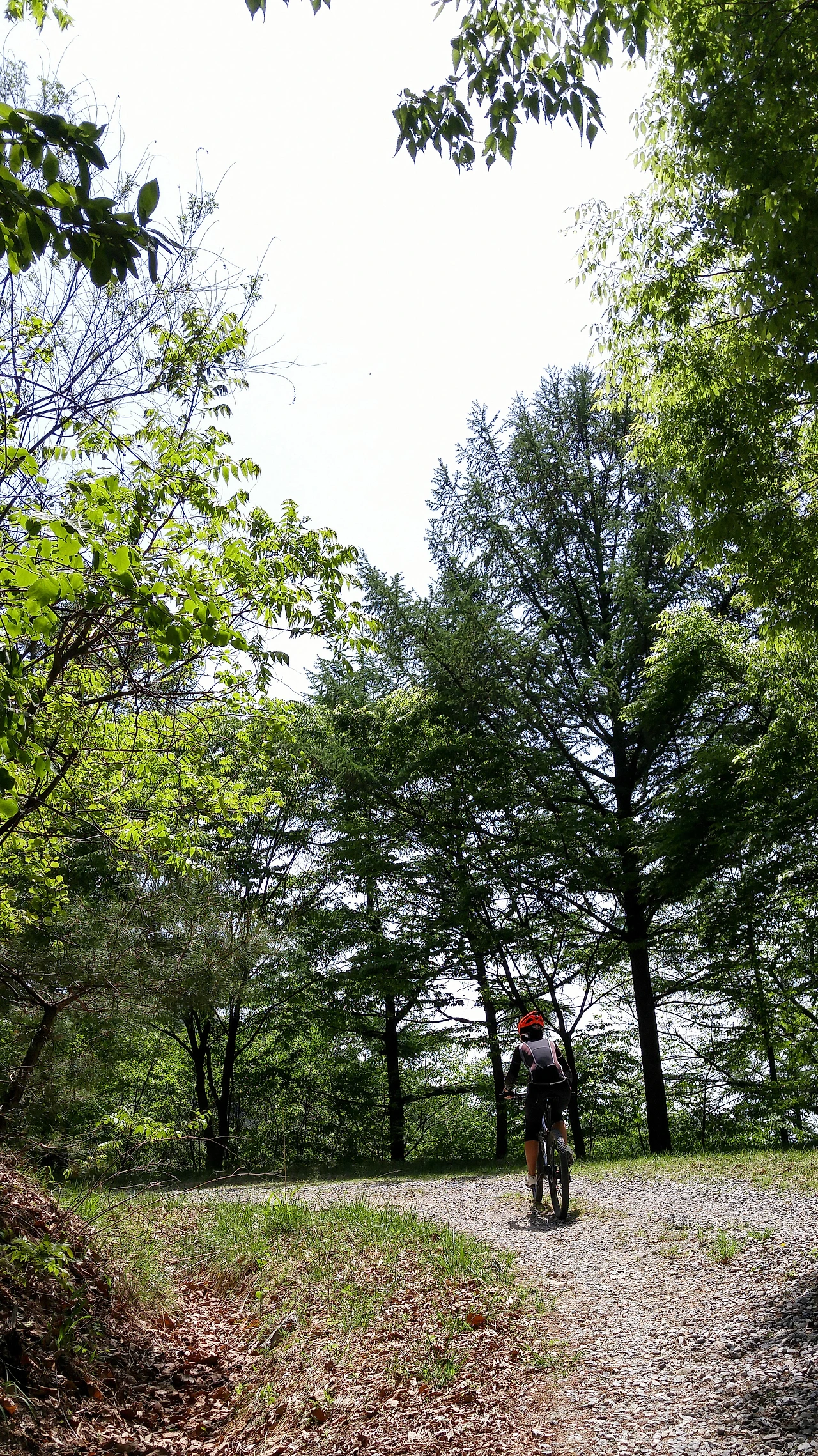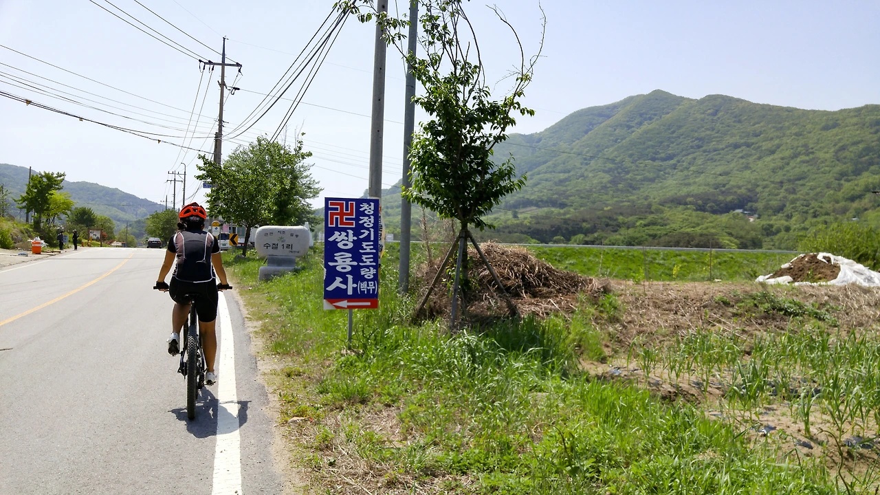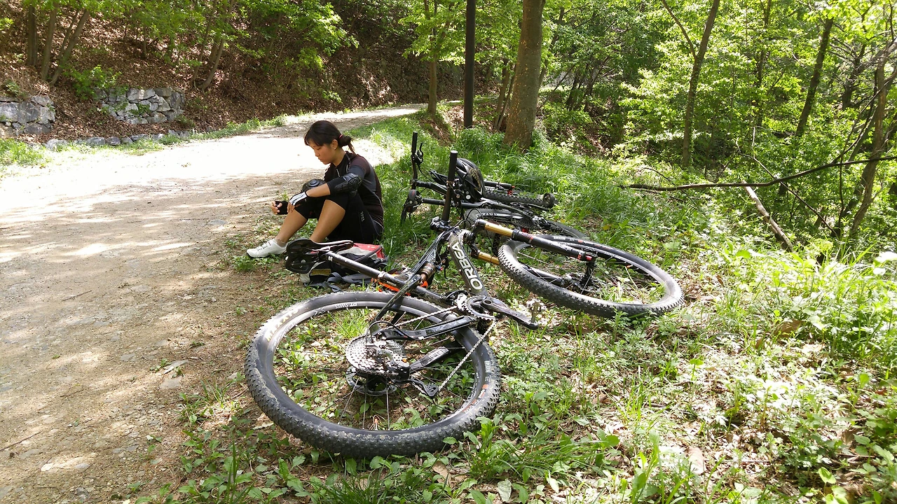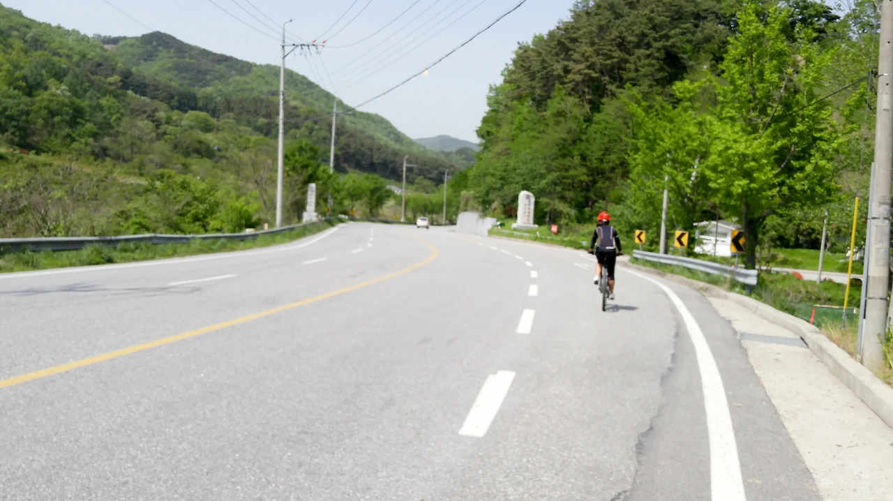 한참 달리다 보면 광덕산 임도에서 단 한 번 있는 약간 급경사인 헤어핀 코스가 나온다. 그렇게 어렵지 않은 경사이긴 하지만 잘 올라간다. 다음에는 좀 더 가파른 경사가 있는 코스를 가게 될 것이다.