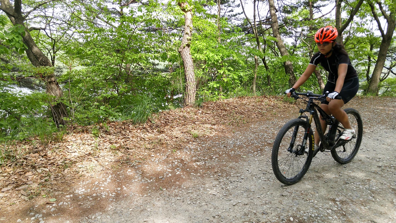 오르막이 있으면 내리막이 있는 법. 임도의 끝에 다가갈수록 점점 내리막이 많아진다. 아직은 브레이킹에 익숙하지 않기 때문에 두 손가락으로 레버를 잡는 투-핑거 브레이킹을 한다. 차차 익숙해지면 한 손가락으로도 충분할 것이다.