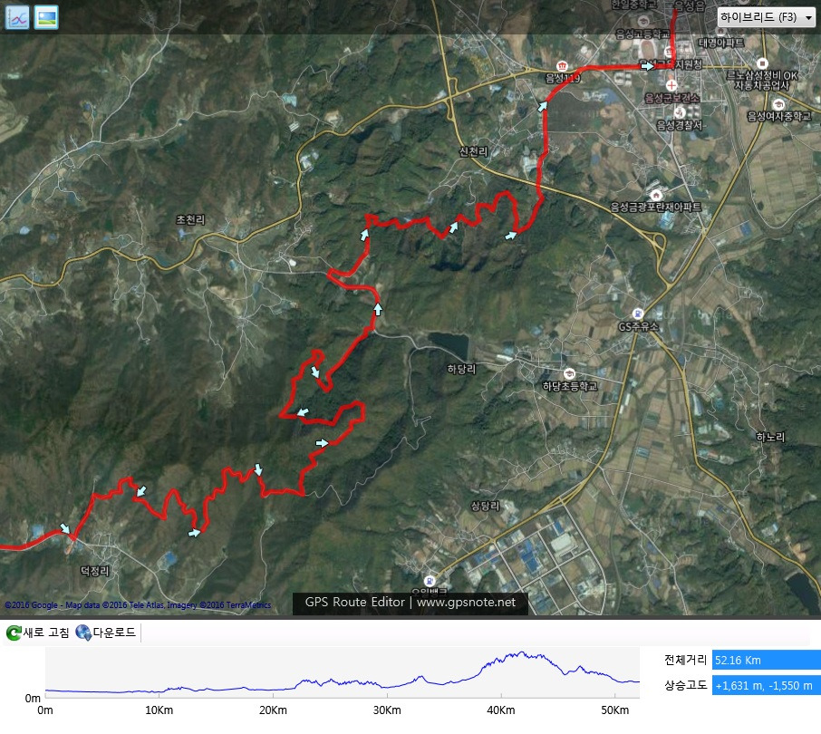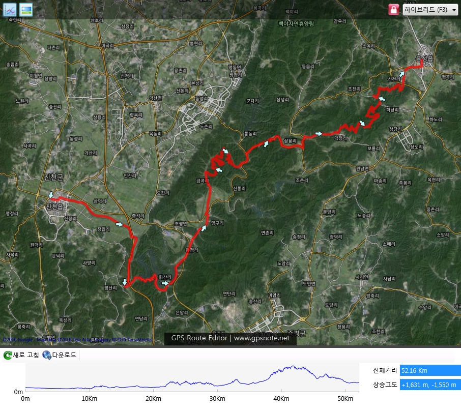 진천부터 음성까지 총 52km 정도 달렸다. 임도 중에는 풍경이 변하지 않고 계속 똑같이 보이는 지루한 임도가 많은데 이 진천 코스는 주변 경관이 적당하게 바뀌면서 지루할 새가 없는 좋은 코스이다. 멀리 와서 타기에는 코스가 짧다고 생각한다면 이번에는 가지 않은 맹동 저수지를 돌아 구진테 고개를 넘으면 충분히 길어질 것이다.