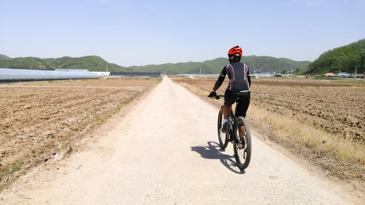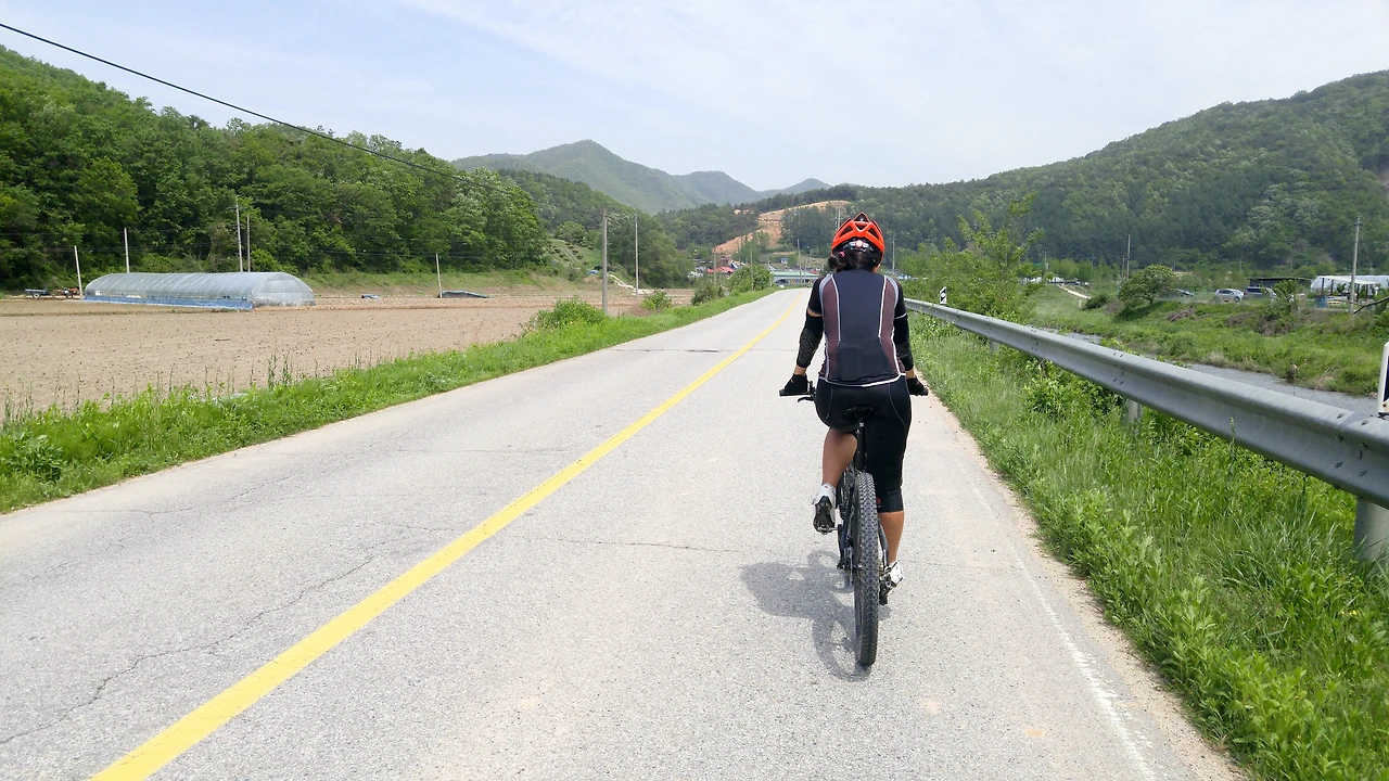 두타산 옆으로 포장도로를 달리다가 직선으로 잘 뻗은 농로로 빠진다.