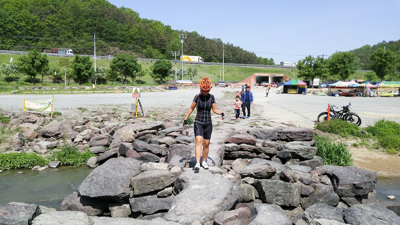 자전거를 들고 농다리를 건너가면 초평저수지 쪽으로 나오게 되는데 지니님이 클릿 신발 때문에 건너기 싫어한다. 비포장길로 약간 돌아가면 미호천을 건너서 초평저수지 쪽으로 갈 수 있다.