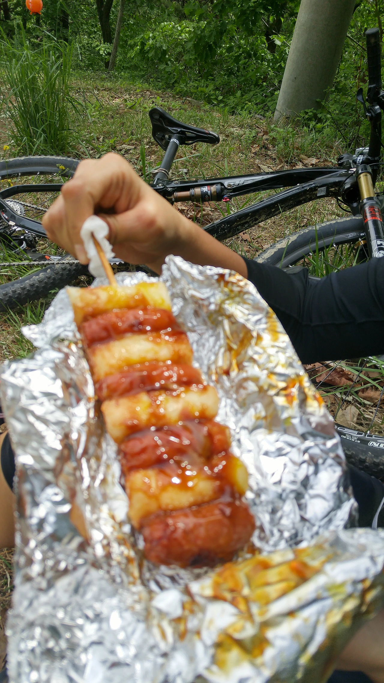 임도 입구에서 잠시 쉬면서 간식 시간을 갖는다. 진천 읍내에서 김밥을 사온다는걸 깜빡해서 농다리 앞 노점에서 소떡소떡을 포장해왔다.