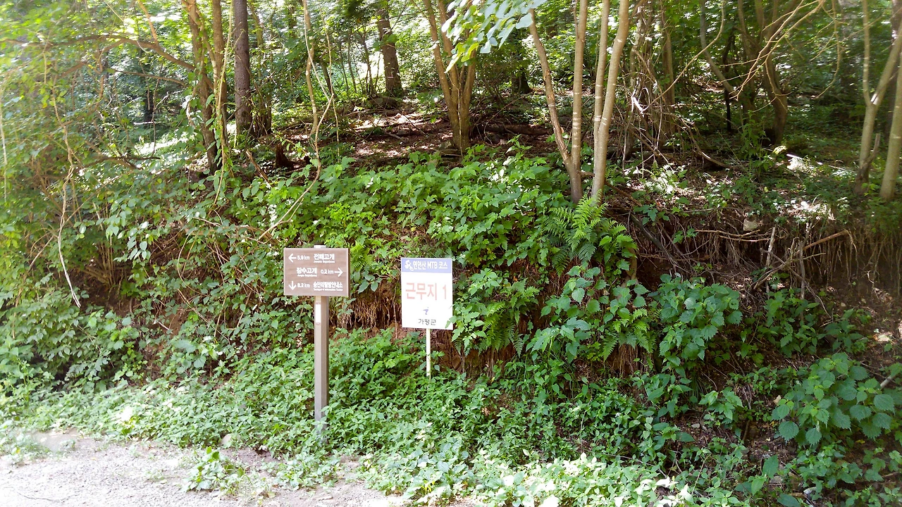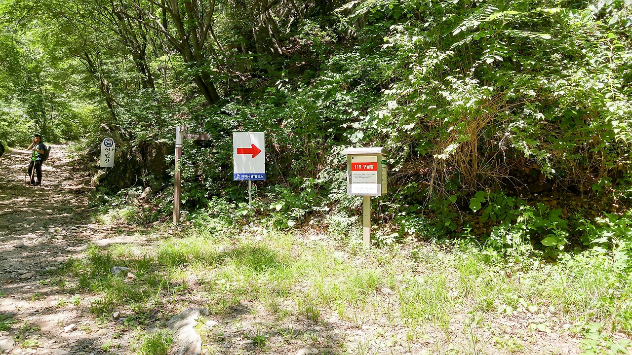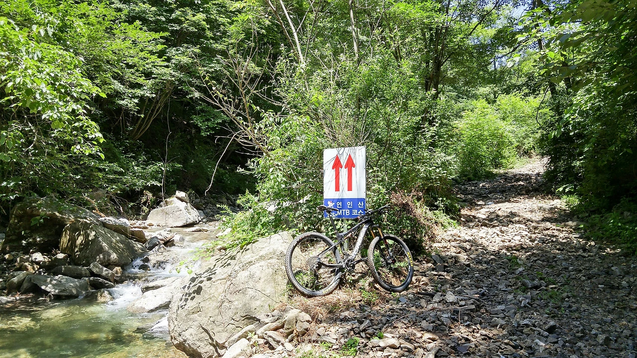 중간에 MTB 코스 이정표가 또 나타난다. 여기서 계곡 본류를 벗어나게 된다. 여기서 계속 계곡 본류를 따라 가면 허리까지 물이 차는 곳을 포함해서 계곡을 여러 번 건너고 돌탱이길을 끌고 들고 올라가야 임도와 만난다.