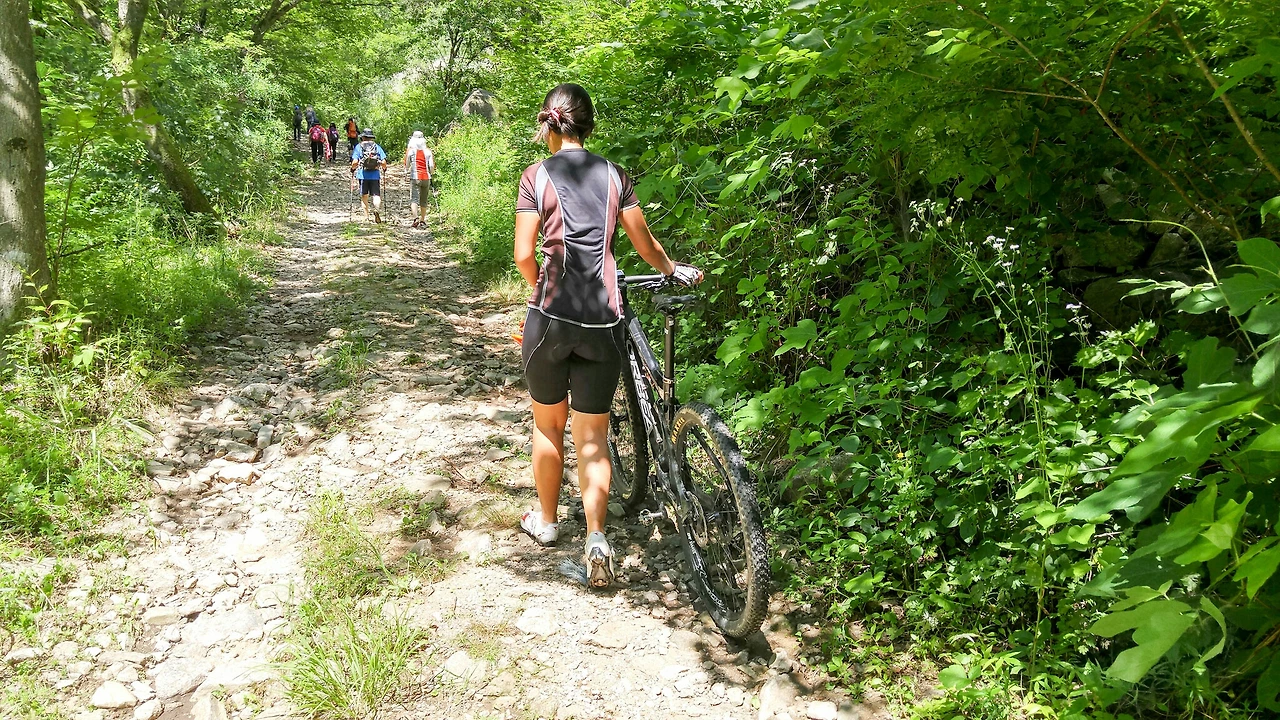 조금 거친 비포장길에 등산객들이 많아서 끌고 간다.