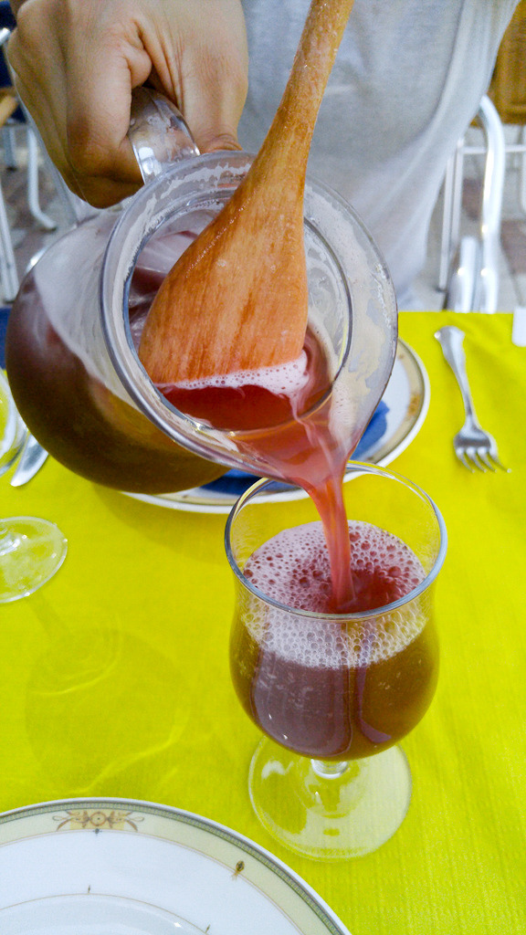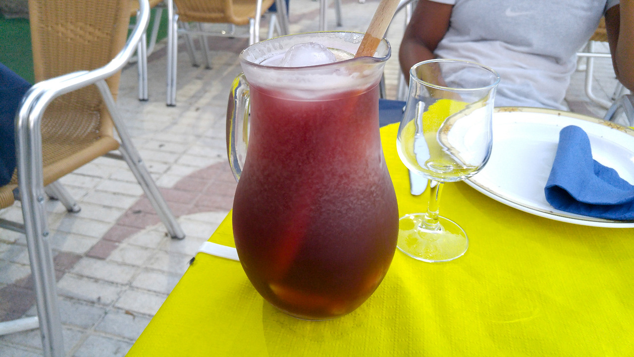 그러던 중에 항구 맨 뒤쪽의 식당에서 빠에야를 먹기로 한다. 일단 샹그리아부터 한 잔 하기로 한다. 샹그리아는 보통 1 리터씩 파니 둘이 뜻이 맞지 않으면 마시기 힘들다.