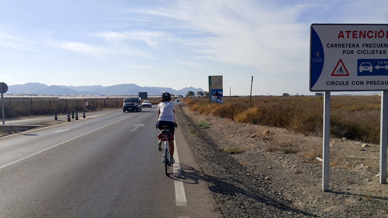 자전거를 추월할 때 자전거로부터 1.5m 이상 떨어지라는 표지판이 여기저기 있다. 이 표지판이 없어도 스페인의 운전자들은 느릿느릿 달리는 우리에게 경적 한 번 안 울리고 멀찍이 떨어져서 추월해간다.
