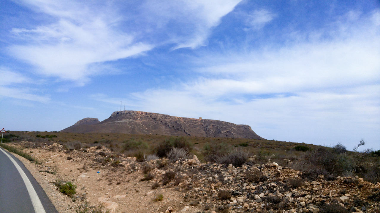 Agua Amarga에서 잠시 쉬다가 다시 길을 나선다. 아직 갈 길이 멀다. 오른쪽 산 꼭대기에 오래된 성같은 유적이 보인다.