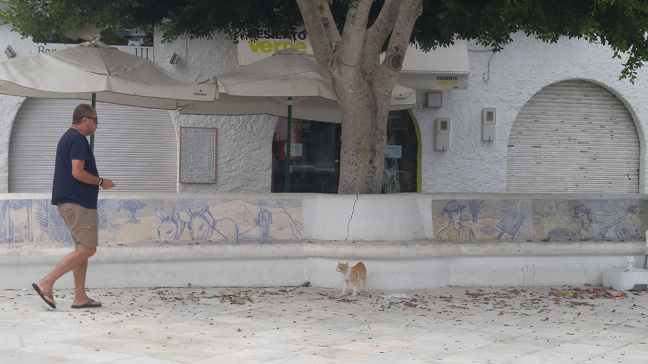 목도 마르고 배도 고프게 달려 고개를 넘어서 작은 마을인 Agua Amarga로 내려갔다. 이 동네에는 고양이들이 많다. 커다란 아저씨가 무섭게 다가가니 고양이 한 마리가 경계하면서도 먹을 것을 주려는걸 아는지 기대한다.