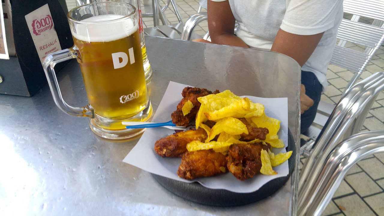 근데 이 집... 싸다. 우리나라의 XX비어 같은 느낌인데 안주가 훨씬 다양하다. 알고보니 우리나라 맥주집들처럼 스페인 여기저기에 체인점이 있는 유명하고 저렴한 맥주집이다. 기본적으로 감자튀김도 팔지만 우린 치킨윙에 생맥주를 마신다.