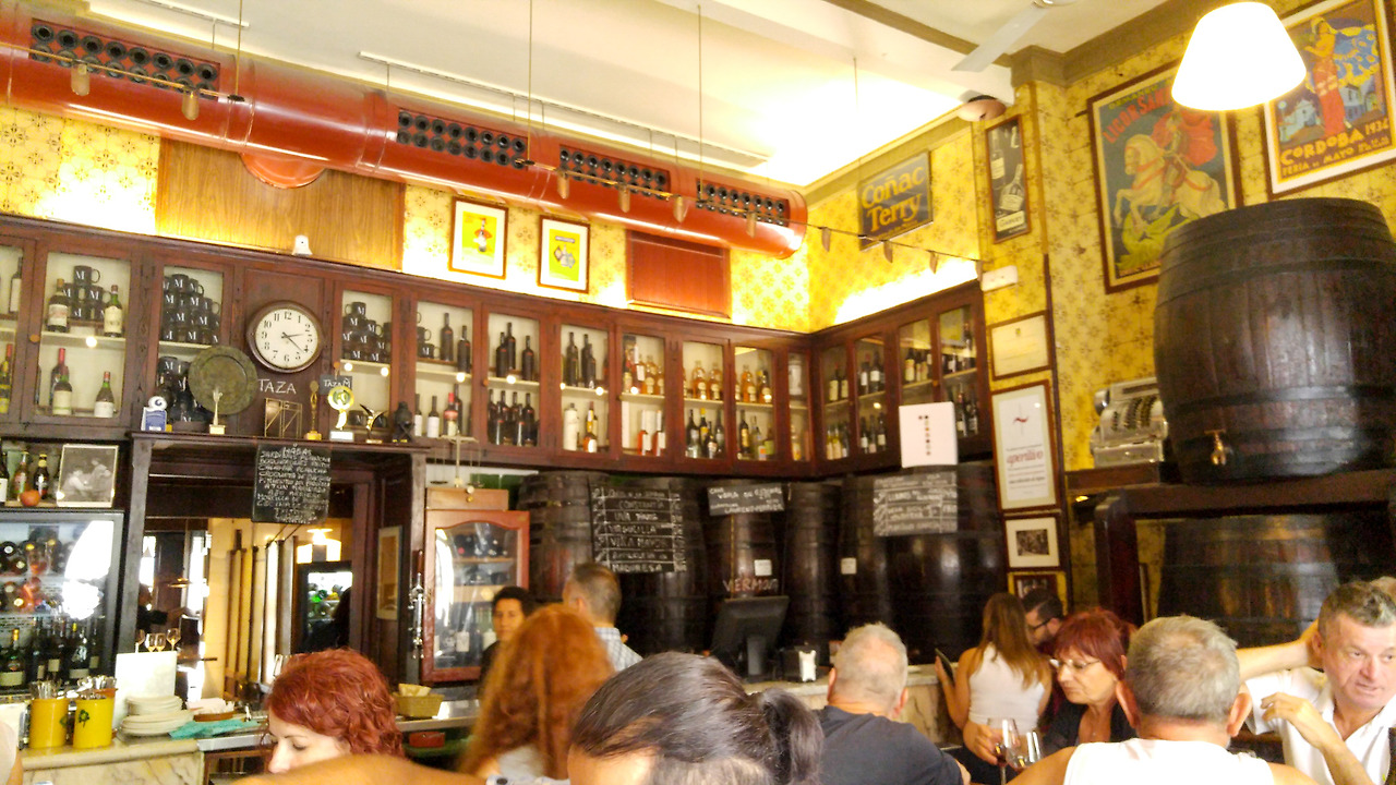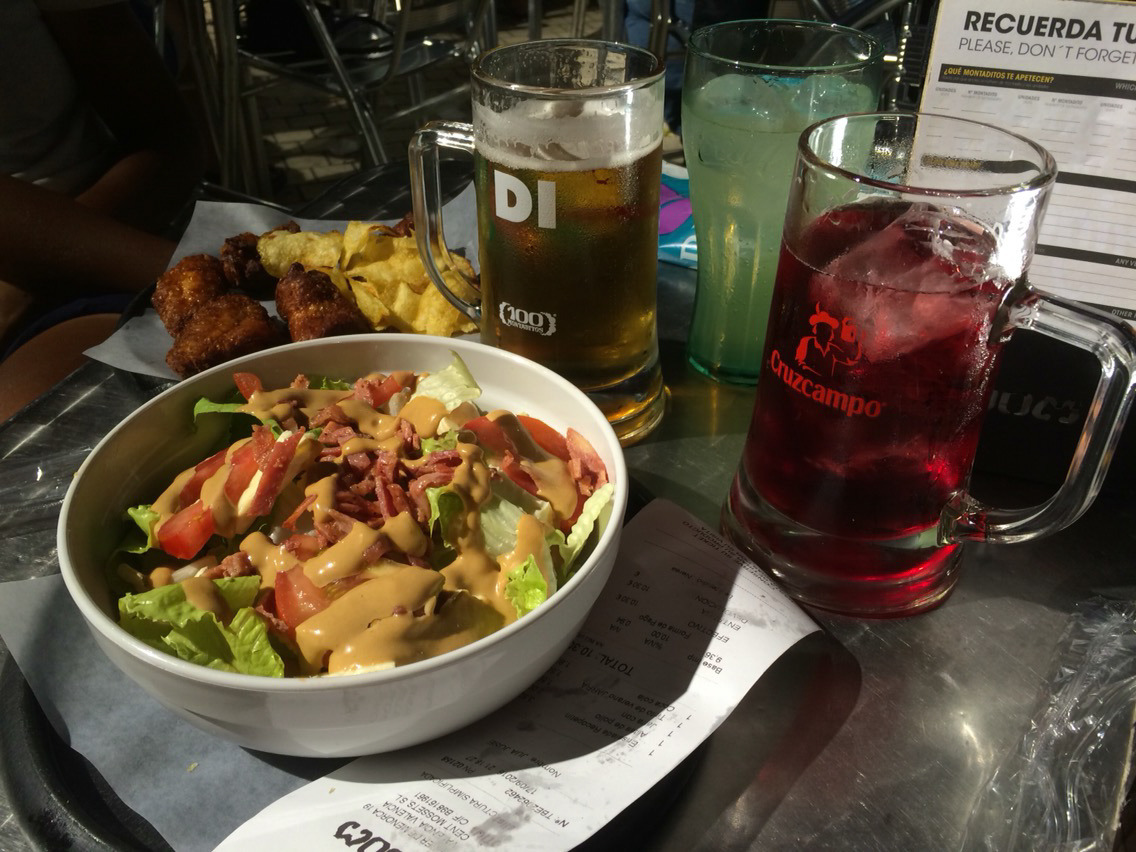 호텔 바로 아래층의 100 montaditos로 간다. 지니님은 생맥주를 마시고 나는 띤또 데 베라노(tinto de verano)를 마신다. 어제도 먹었던 치킨윙과 일부러 시키지 않으면 아채 먹을 일이 별로 없으니 안주는 샐러드를 주문한다. 띤또 데 베라노는 적포도주에 탄산수와 얼음을 넣은 것으로 여름에 시원하게 마시는 포도주이다.