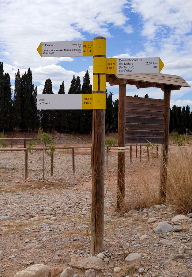 길 옆에 이정표가 있는데 별 도움은 안 된다. 여기서 2km 정도 강 상류로 가면 Desembocadura del Millars라는 자연 보호구역이 있다고 하는데 우린 이 사막같은 곳을 건너서 빠져나가는 것 외에는 관심이 없다.
