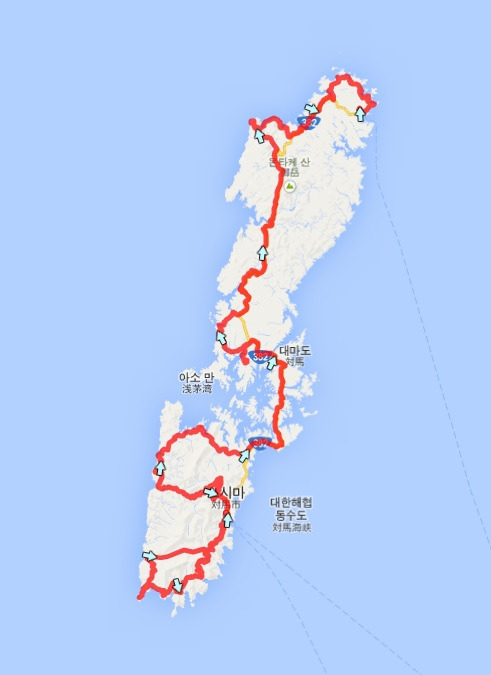 7. 대마도는 90%가 산지라 온통 오르막만 있고 평지가 드뭅니다. 오르막이 있는 100km 정도의 코스를 다닐 수 있도록 연습하지 않으면 경치를 즐길 여유가 없을 겁니다.