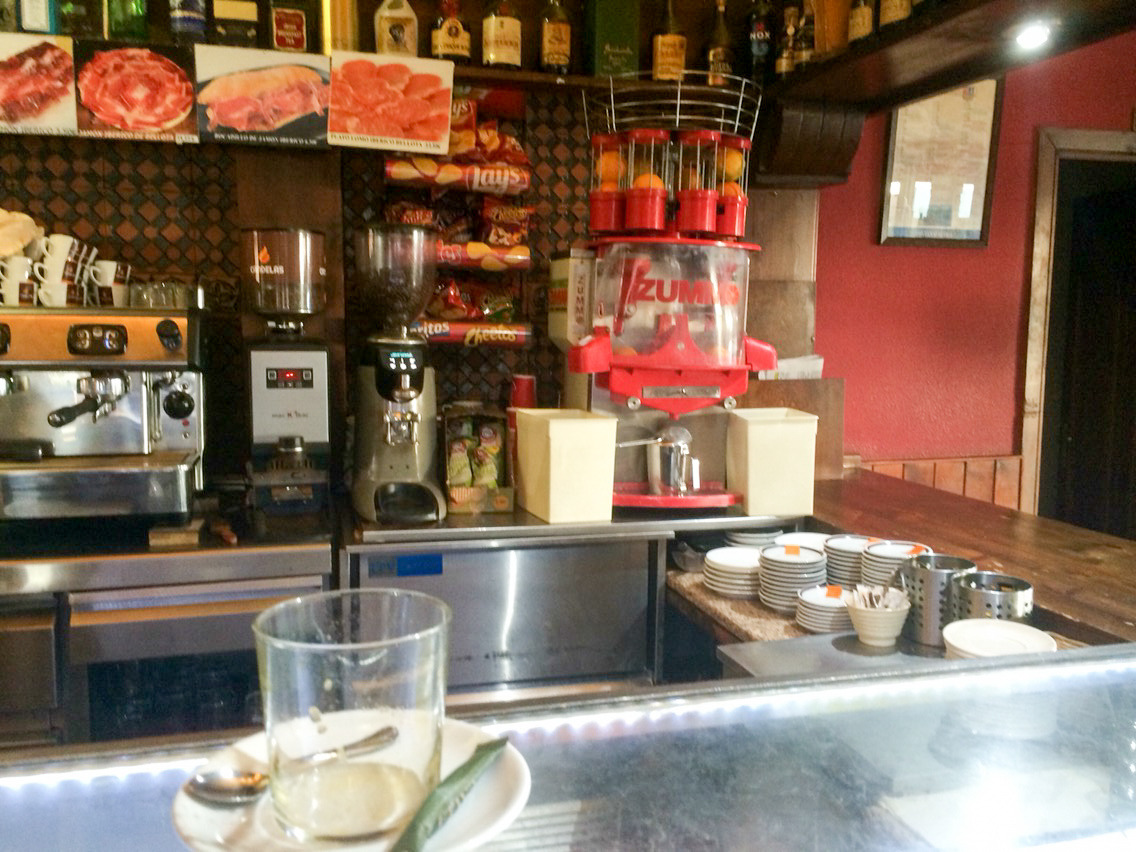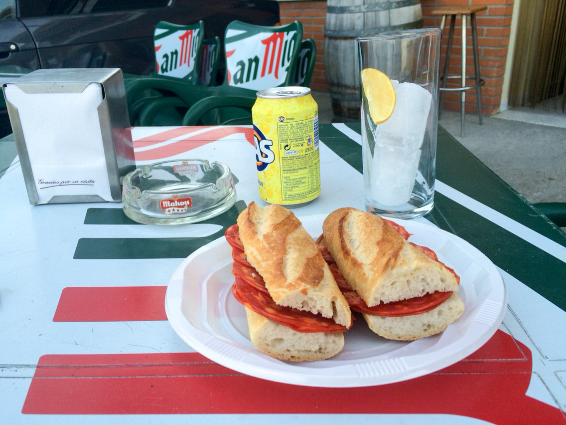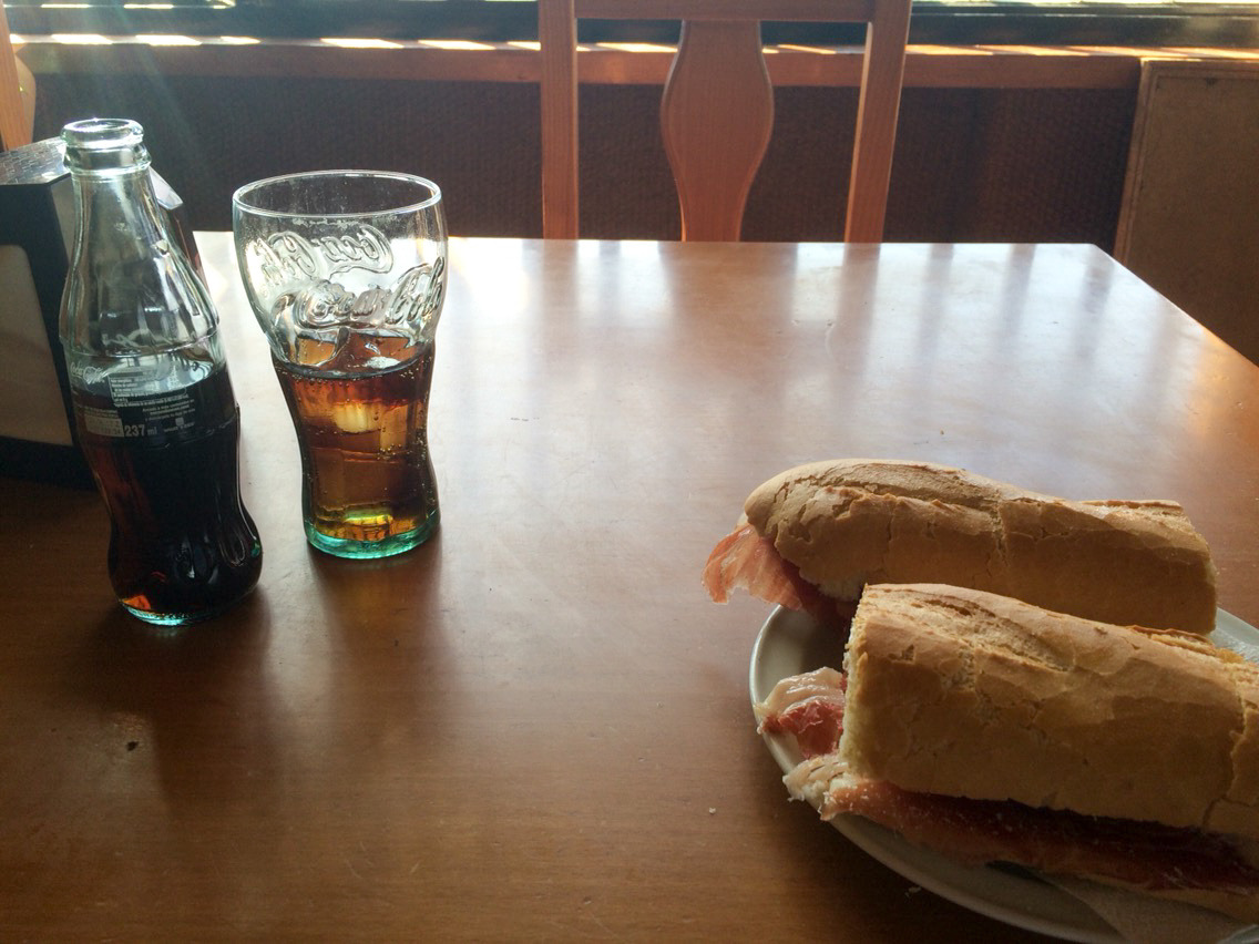 스페인의 딱딱한 바게트 샌드위치. 오랜만이다, 보까디요.. 아직 오전이라 바에는 타파스가 거의 준비되지 않은 상태였다. 어쩔 수 없이 쵸리소가 들어간 보까디요를 선택했다. 목이 메여서 음료를 두 캔이나 마셨다.