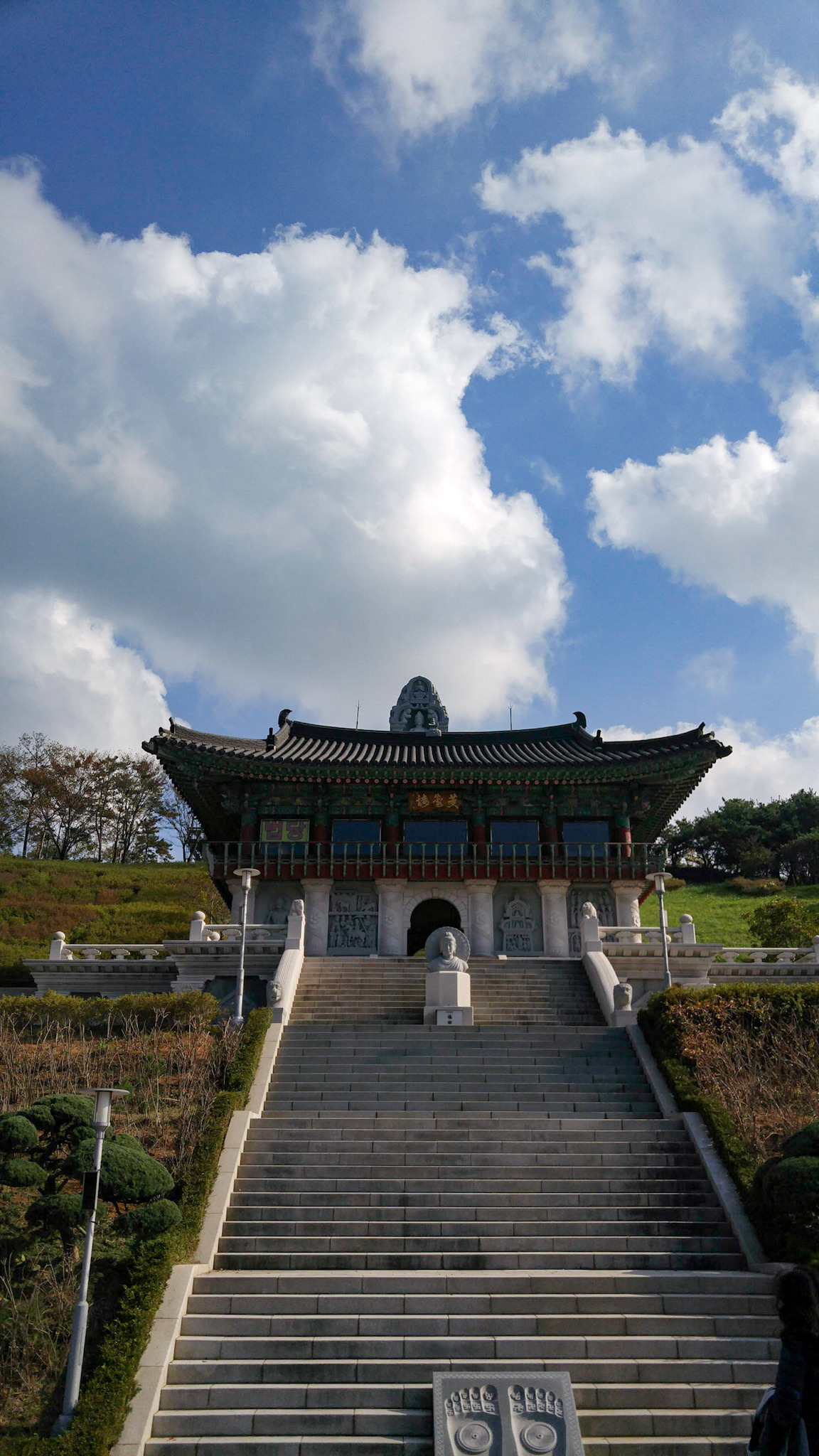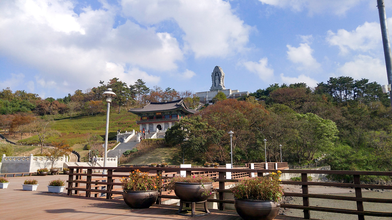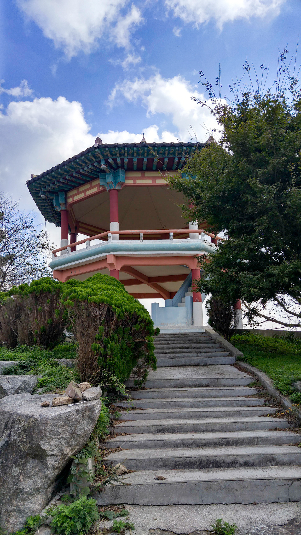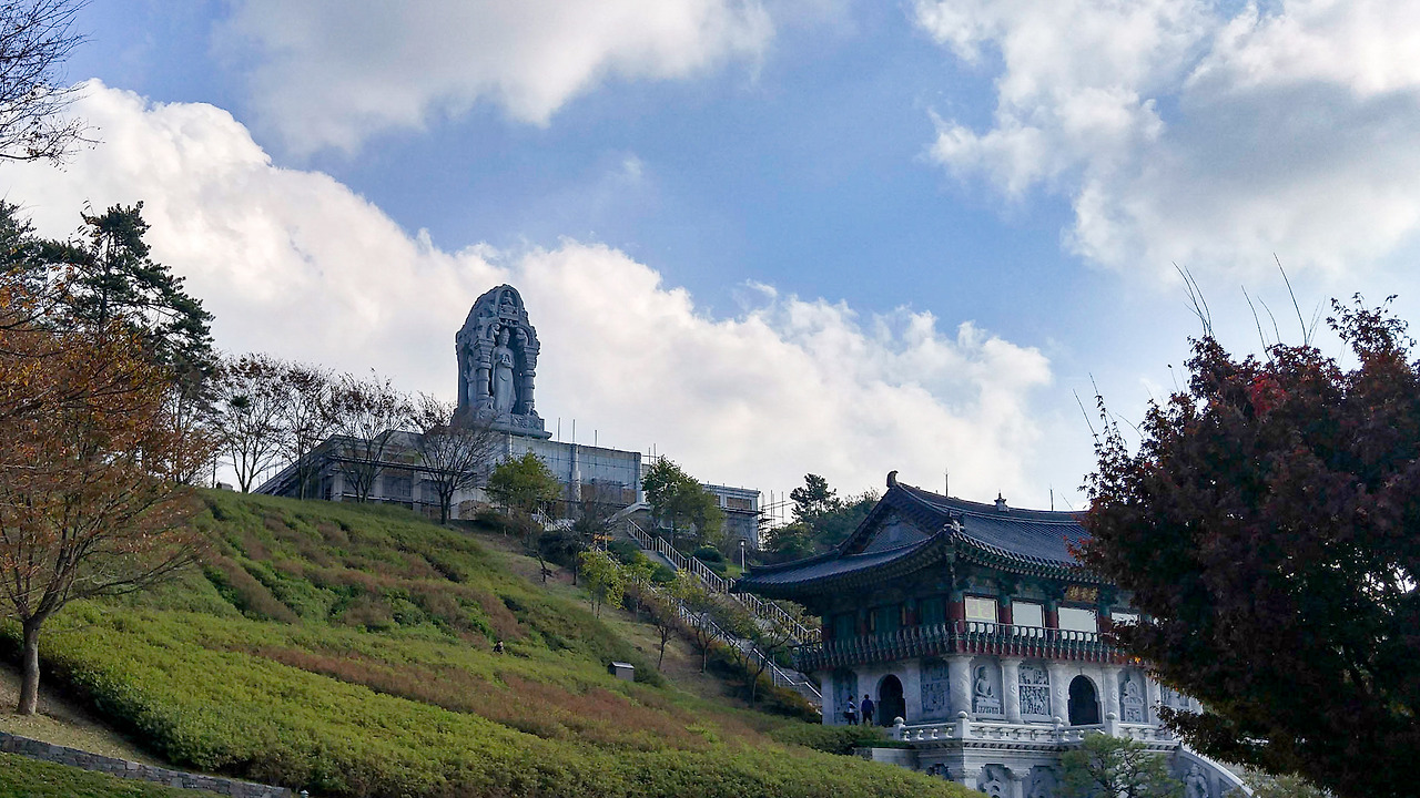 정자에서 내려와서 잠깐 걸으면 큰길로 빠져나오게 된다. 절이 하나 있는데 입구에 다양한 조형을 해놓았다.